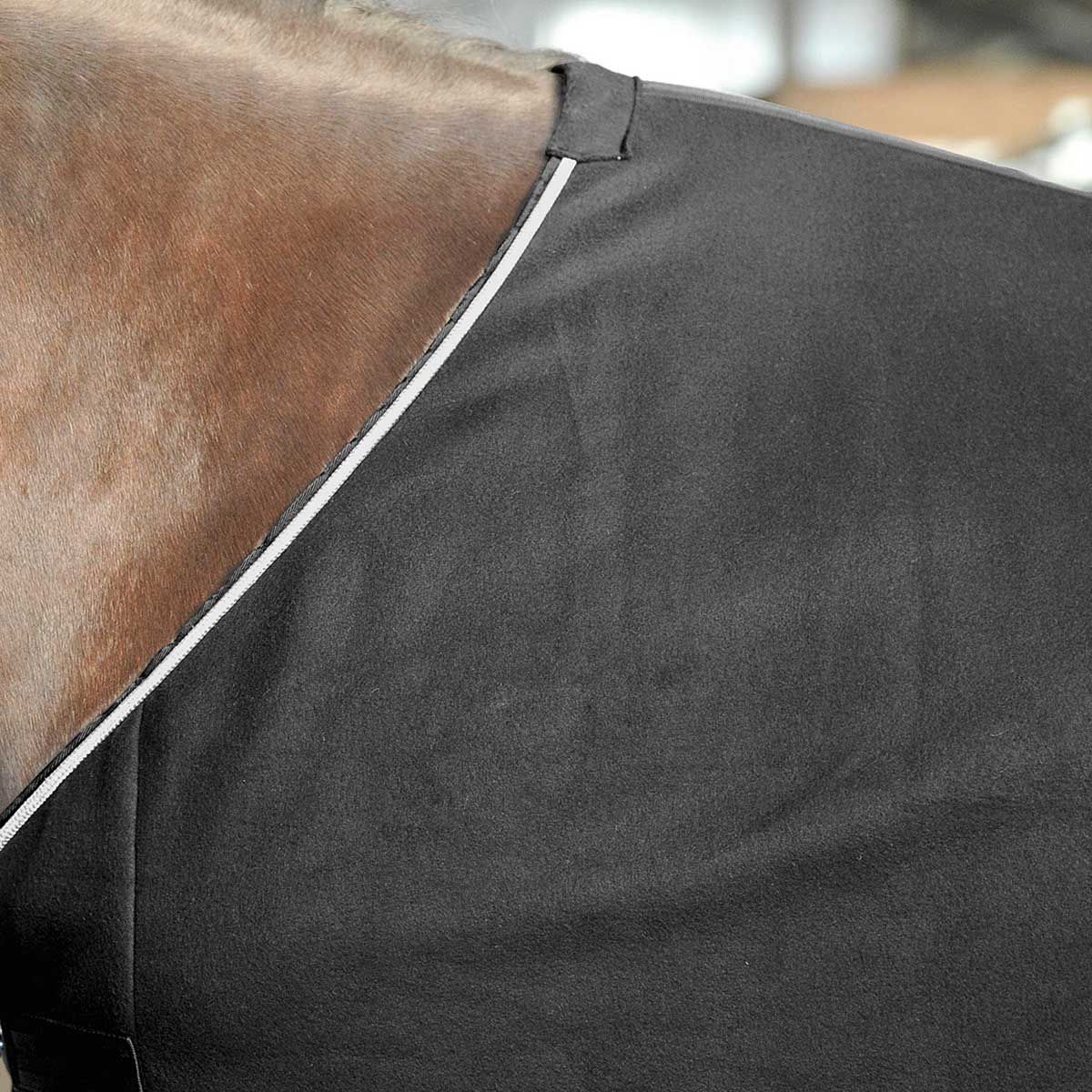 Cuddly soft sweat blanket by BUSSE has an ideal moisture transport. The absorbent material wicks sweat outwards, protecting your horse from the cold and drafts. It is fast-drying, breathable, sweat-wicking and climate-regulating. The special feature of the fleece blanket SHOW is the surrounding contrast cord in silver. The back center night and the flat metal twist lock in the chest area provide the best support.