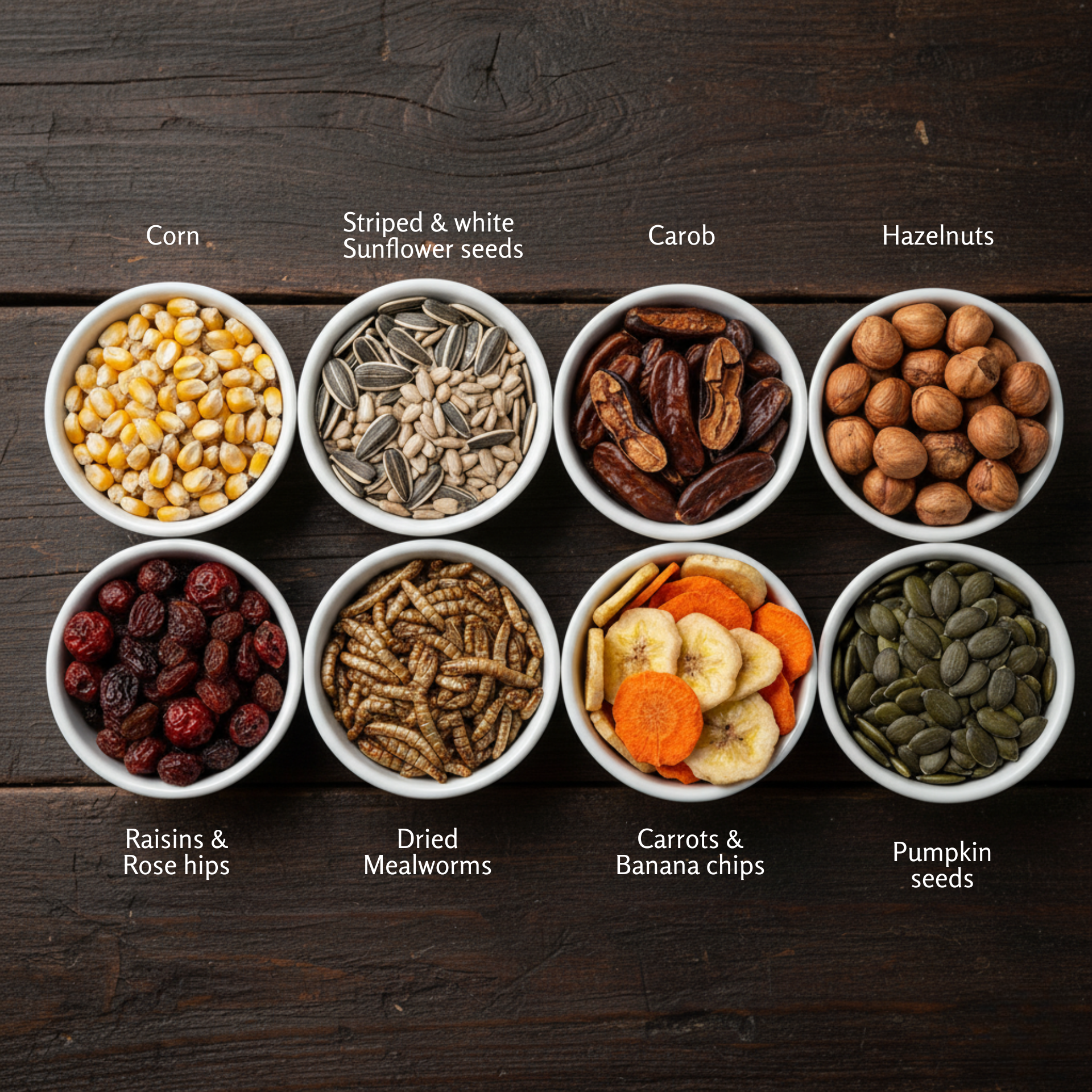 30.00% small maize, 23.00% striped sunflower seeds, 20.00% sliced carob, 10.00% white sunflower seeds, 9.30% hazelnuts, 2.10% sultanas, 2.00% dried mealworms, 1.30% carrot slices, 1.30% banana chips, 0.70% rose hips, 0.30% white pumpkin seeds