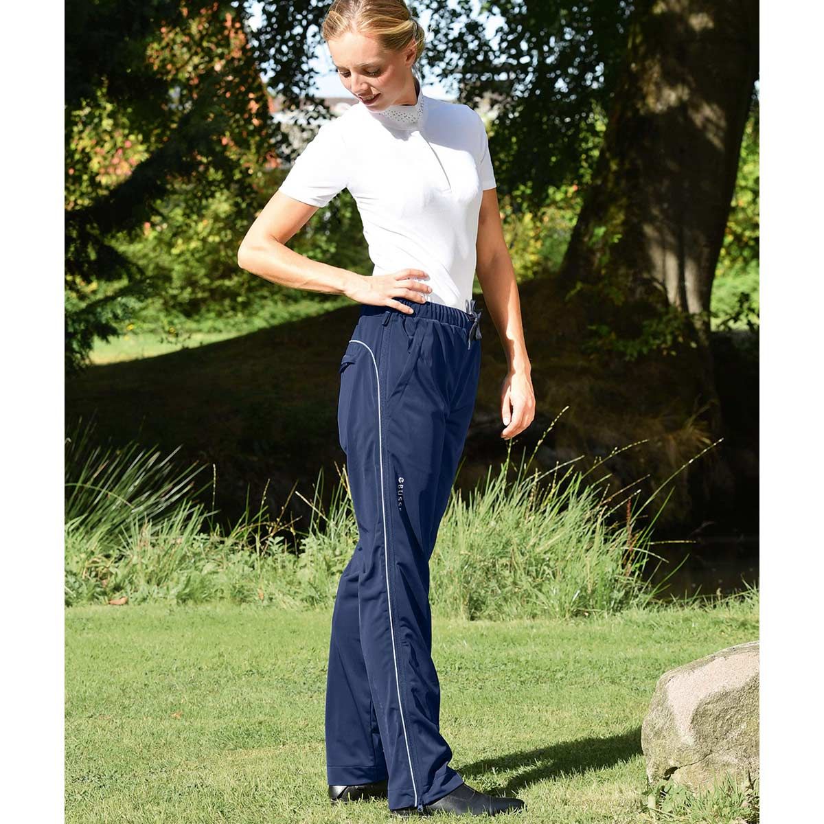 The practical overtrousers for women reliably protect breeches from all dirt and hay. Perfect for stable work or preparation for tournaments. The easy-care, breathable material with stretch effect is comfortable to wear and the comfortable elastic waistband can also be fixed with the drawstring. Continuous 2-way zippers on the sides ensure easy on and off, even with riding boots. Spacious zipped pockets at the front and back offer enough space for a cell phone, keys, treats or mane rings.