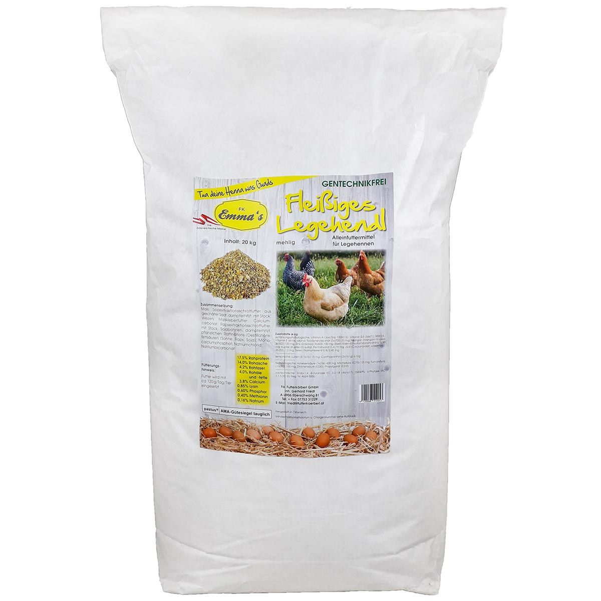 The feed is produced and filled from high-quality raw materials in Austria. The poultry feed is GMO-free, pastus-tested and AMA quality seal-compliant. By buying the chicken feed, you are also making a valuable contribution to environmental protection: