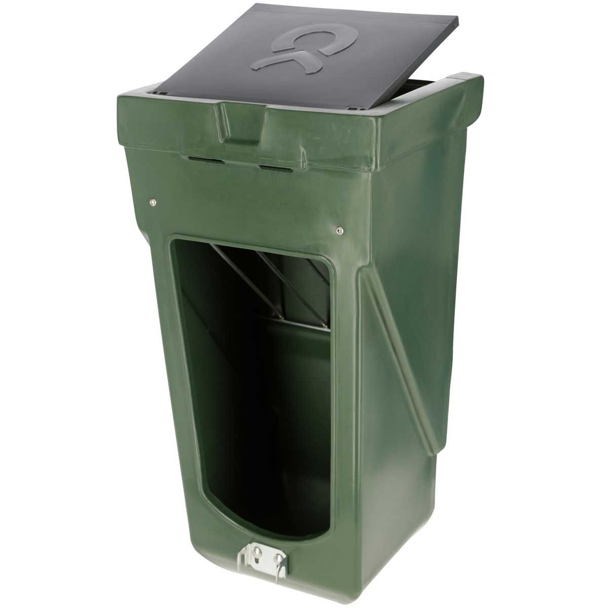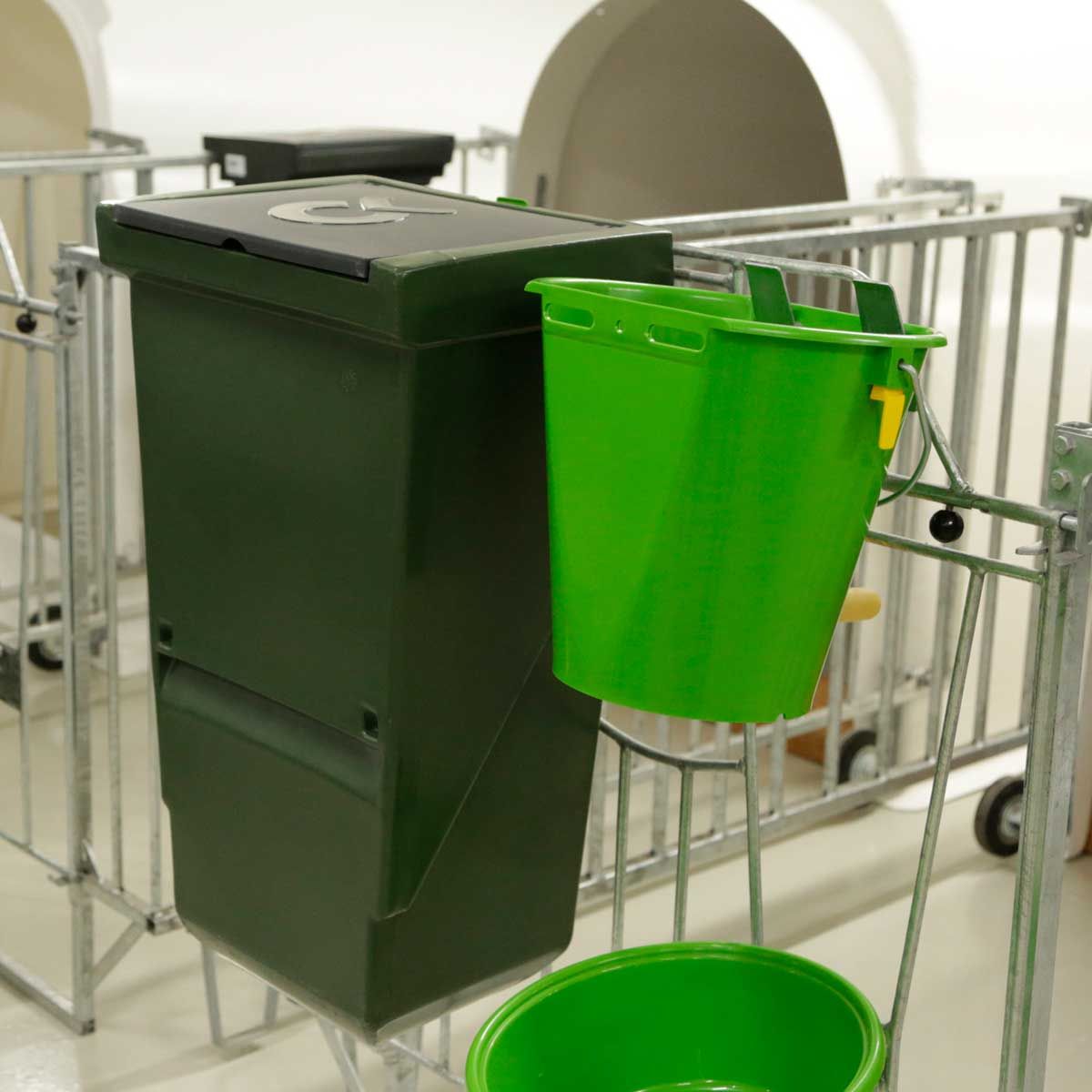 The feed box can be easily filled with roughage through the lid. It also optimally protects the feed from rain. The drain in the feed bowl enables easy cleaning. The feed box is attached to the feeding opening of the calf box or the calf igloo from the outside and is suitable for single calf huts as well as for calf boxes. The suspension bracket is included in the scope of delivery.