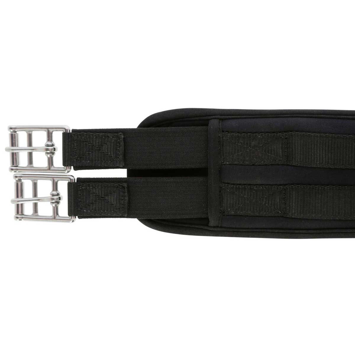 The long belt with elastic band made of synthetic rubber with roller buckles is anatomically curved for more freedom of movement of the horse.