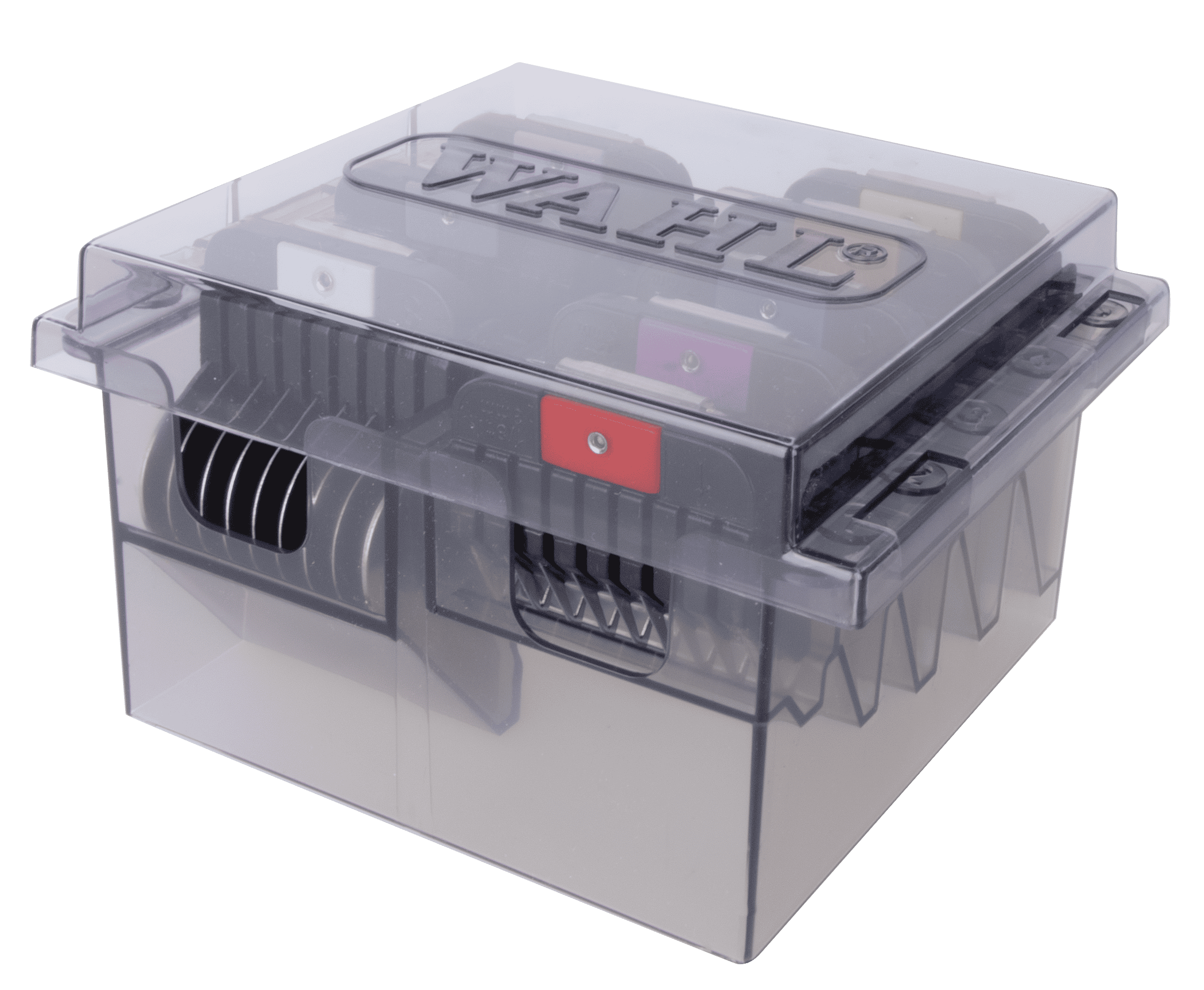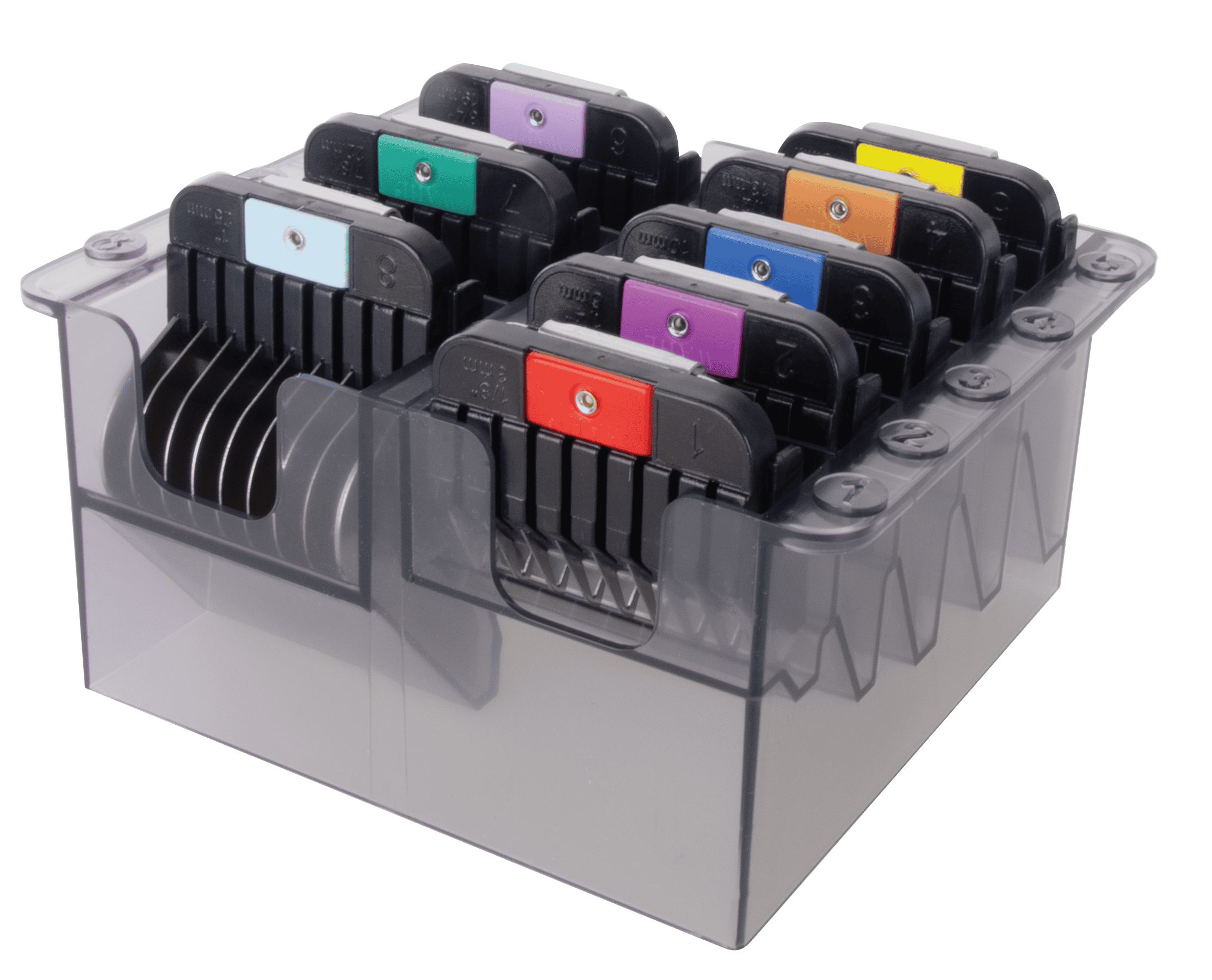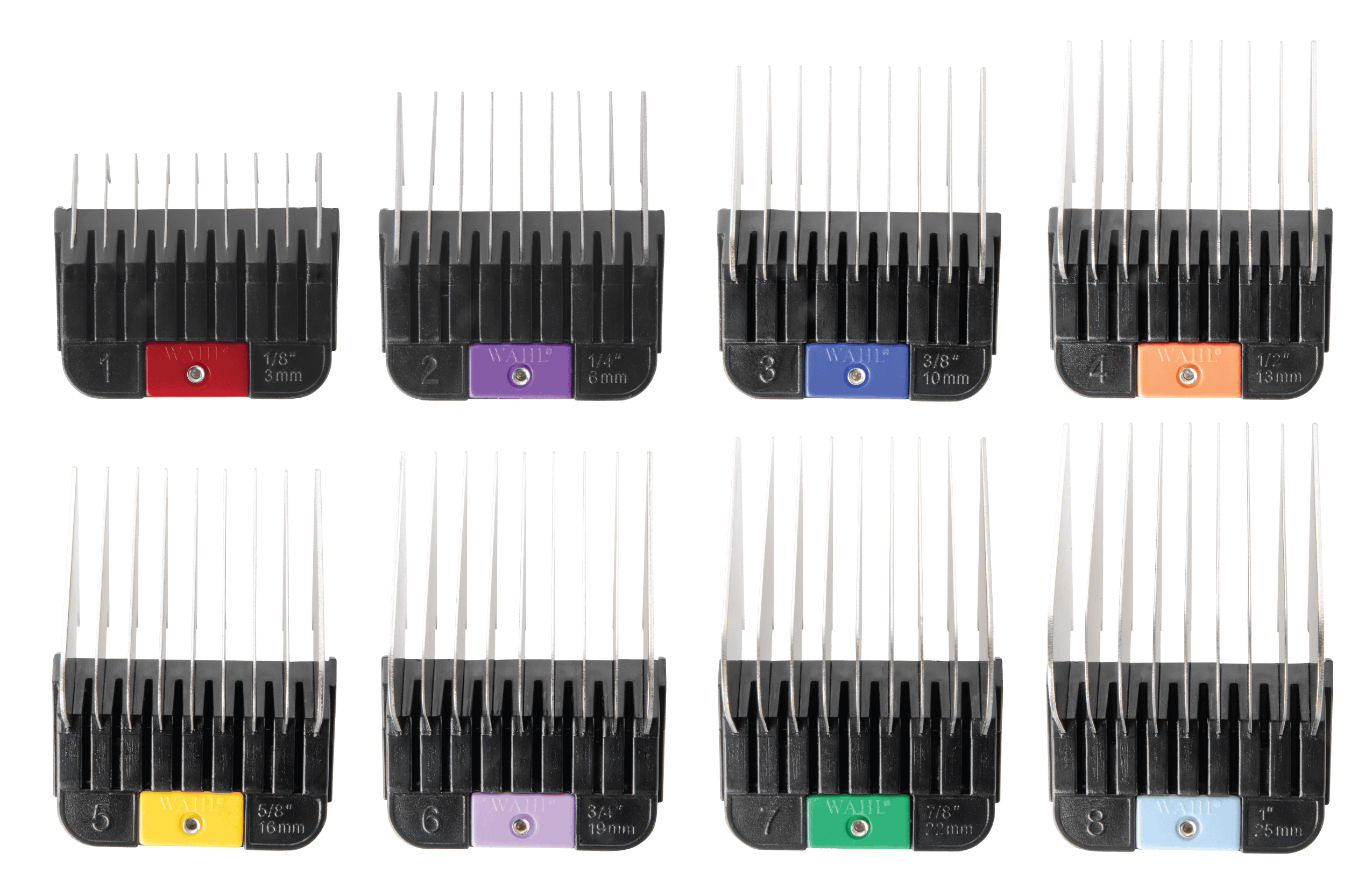 The original WAHL Stainless steel attachment combs are particularly robust and durable and are suitable for the Ultimate WAHLCompetition Series blade sets. The set for all cases! Stainless steel attachment combs with colour coding for easy size orientation in practical storage box, suitable for ® ultimate WAHLCompetition Series cutting sets and ® Competition Series cutting WAHLsets from 0.8 - 3 mm (# 30, 15, 10, 9, 8.5). WAHL® stainless steel attachment combs and a 0.8 mm (#30) blade set are an ideal combination and are ideal for matted fur while at the same time allowing the attachment combs to determine the cutting length! Feel free to use the sizes of the metal attachment combs to find your desired cutting length.