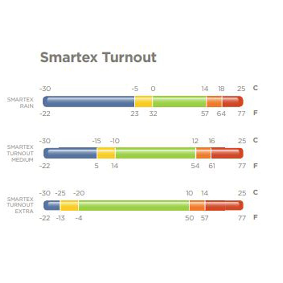 The temperature range of the Bucas Smartex Turnout Medium horse rug is - 10 to + 12 °C.