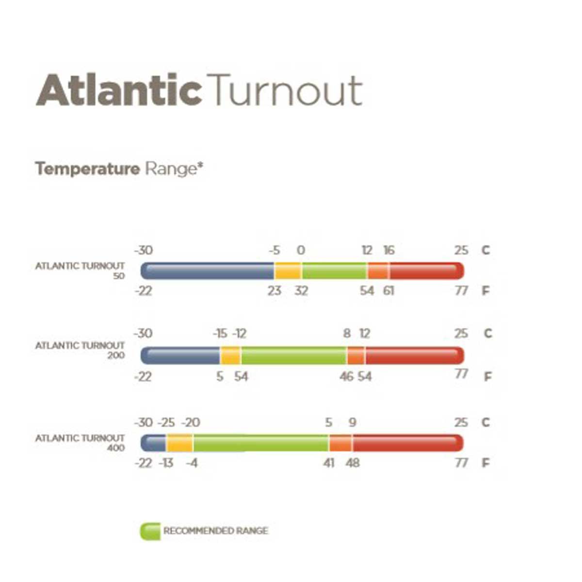 The temperature ranges of the Bucas Atlantic Turnout horse rug are between -12 °C to +8 °C.