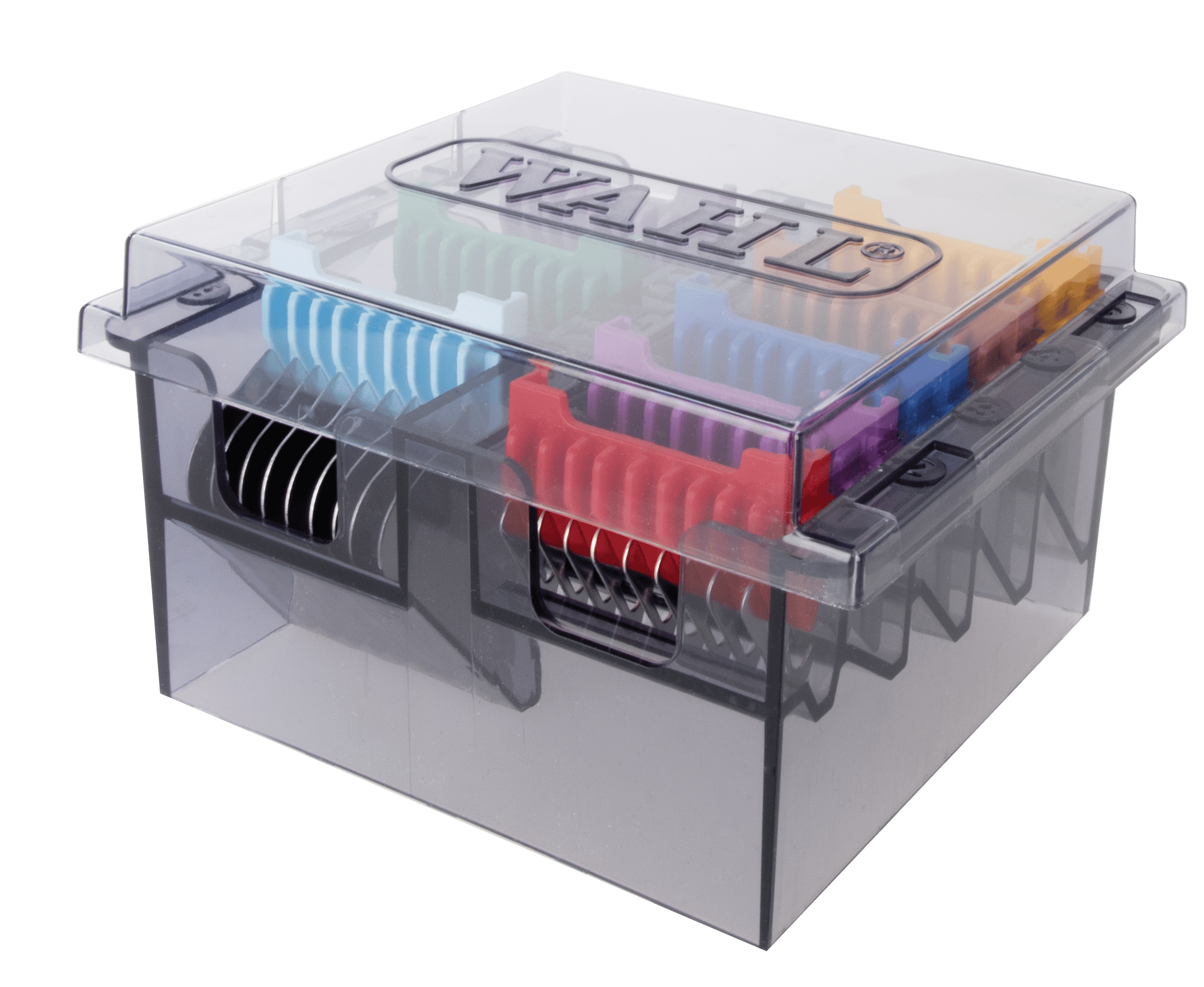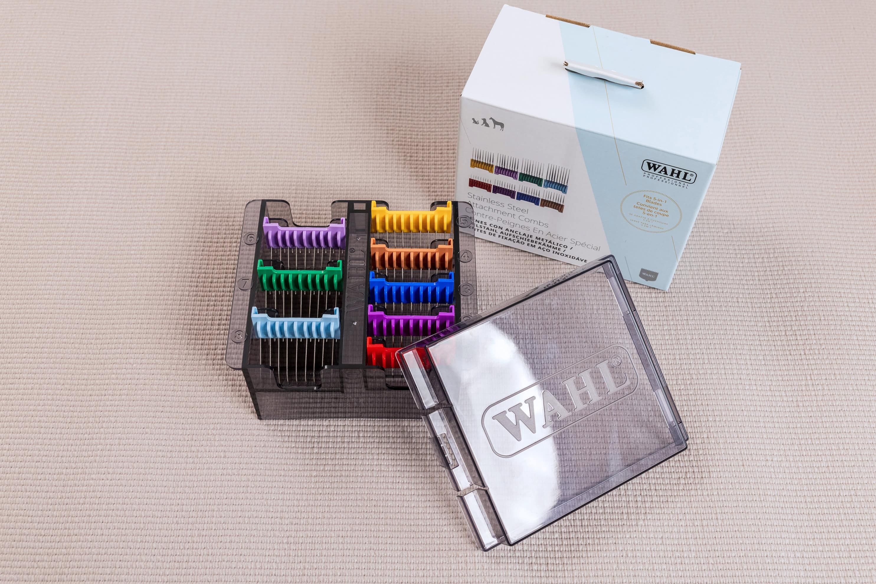 The original WAHL Stainless steel push-on combs are particularly robust and durable - the set for all cases! Stainless steel push-on combs with colour coding for easy size orientation in practical storage box. WAHL Stainless steel push-on combs and a 0.8 mm (#30) cutting set are an ideal combination and are ideal for matted fur while allowing the push-on combs to determine the cutting length! Feel free to use the sizes of the metal push-on combs to get to your desired cutting length. By the simple handling by pushing on the stainless steel combs, you can easily and quickly change between the sizes. For time-saving shearing and an even shearing result up to 25 mm.