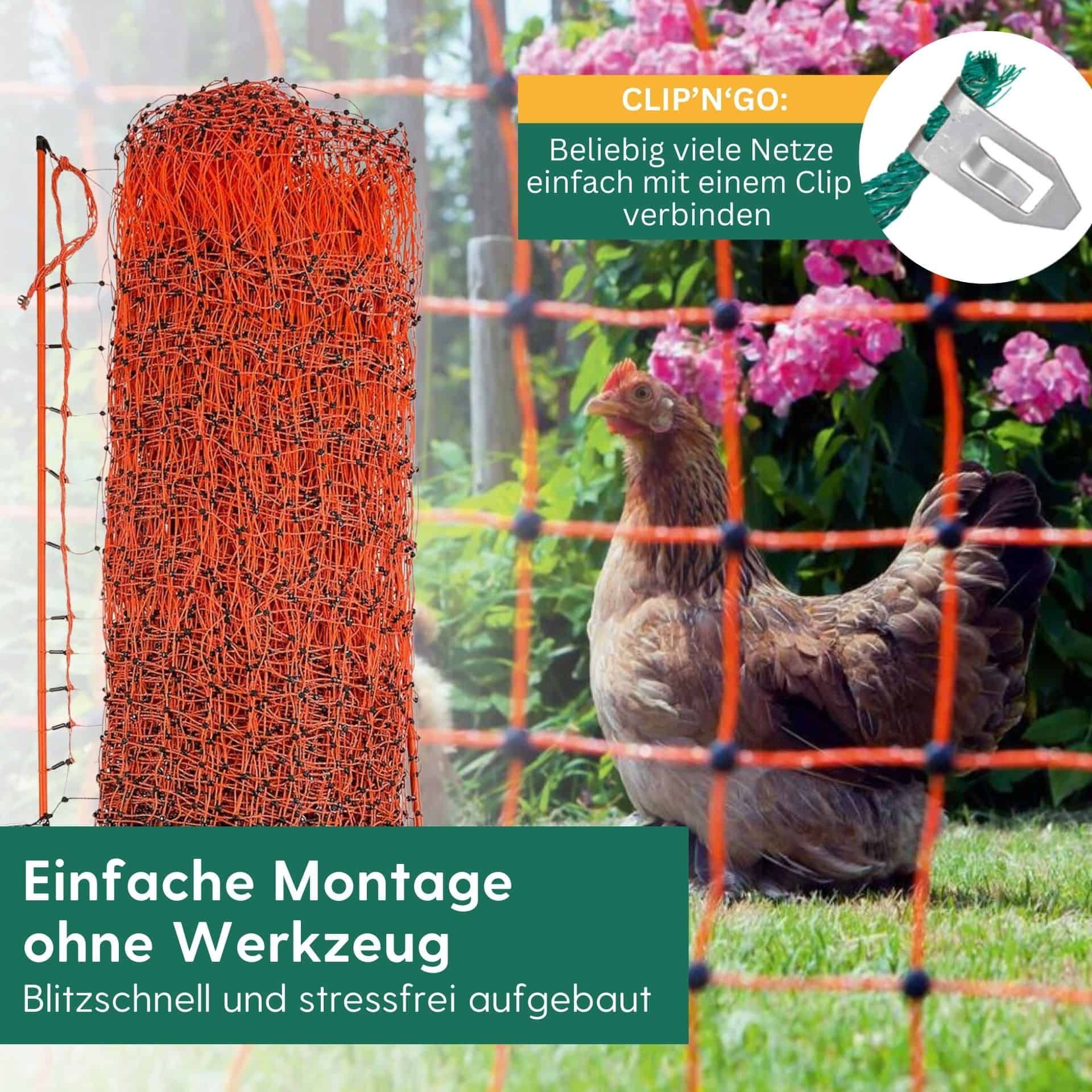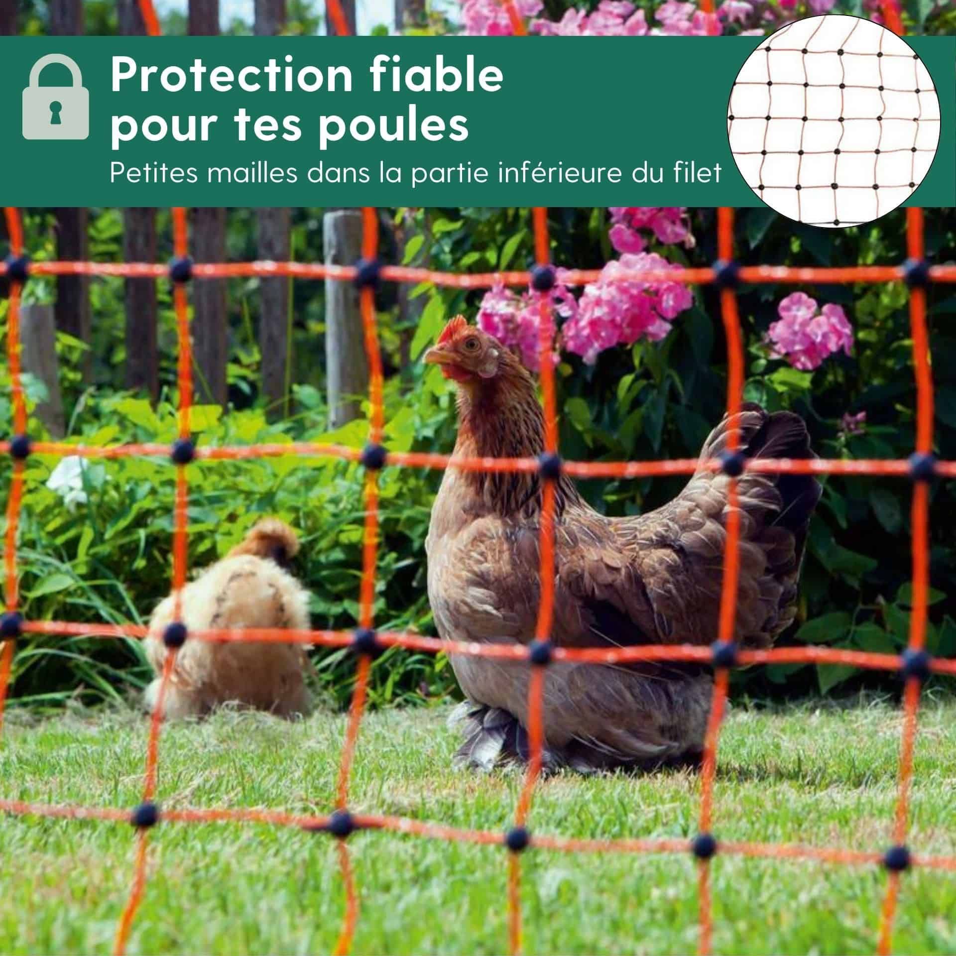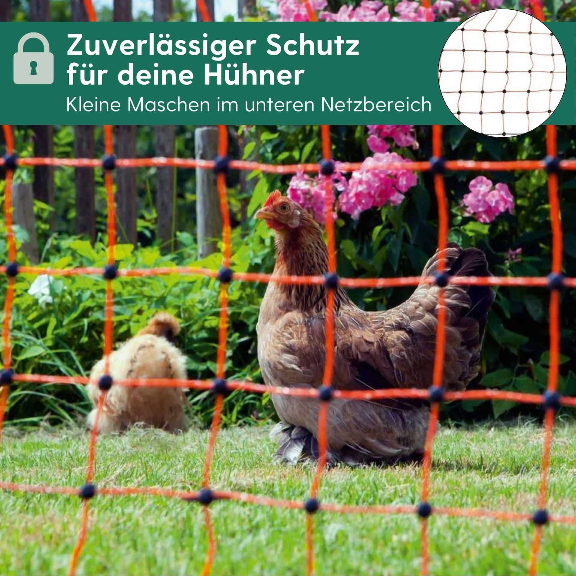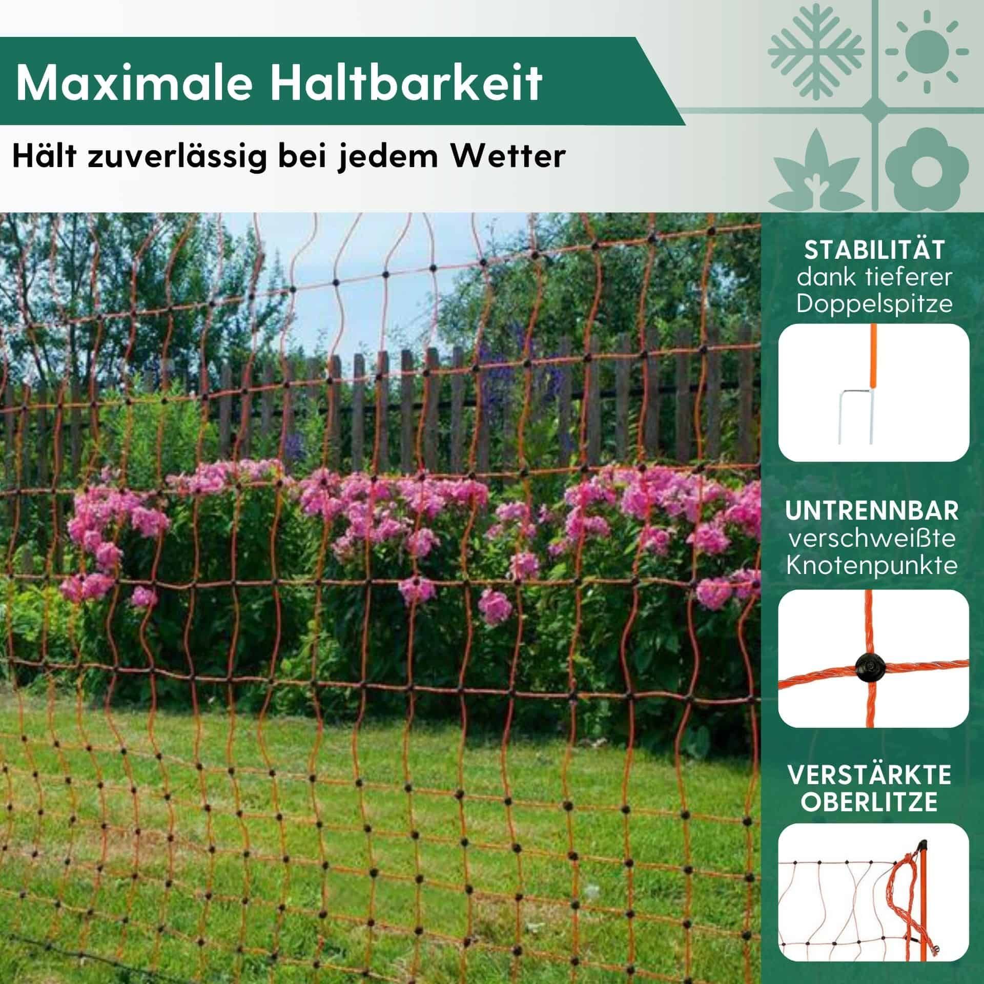 The chicken net has in the lower section narrow meshes which makes the net especially for herding poultry such as chickens, turkeys or ducks. But also other smaller animals can be herded with the mobile fence excellent, such as pigs, goats, dogs or as a sheep net. In addition to the narrower meshes, sagging of the net is prevented with the reinforced upper strand. Sturdy plastic stakes with double points ensure the fence stands well in earthy or sandy soils. The chicken fence is equipped with an orange strand, which makes it especially good for humans and animals visible. The color also provides a natural deterrent and effectively increases herding safety. The good herding properties are also ensured by a plastic seal at each mesh cross point, which is irremovably welded. For additional stability, we recommend placing a wooden post in each corner of the net.