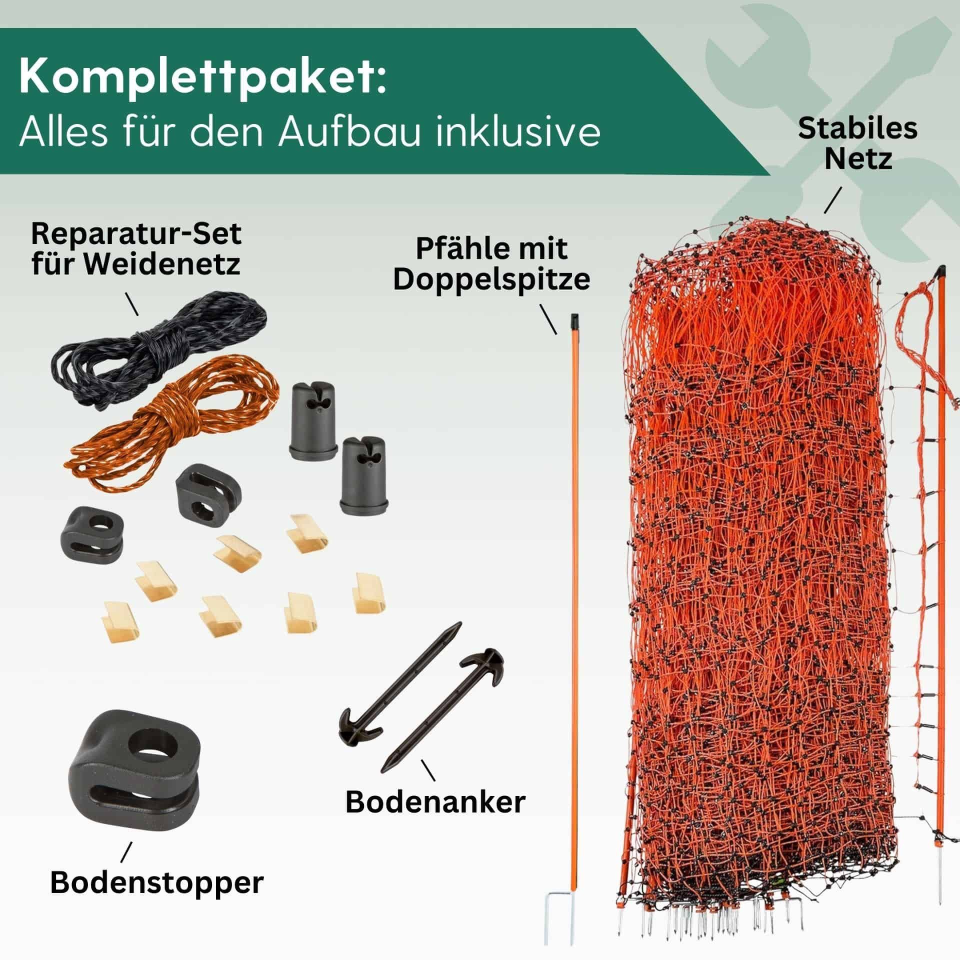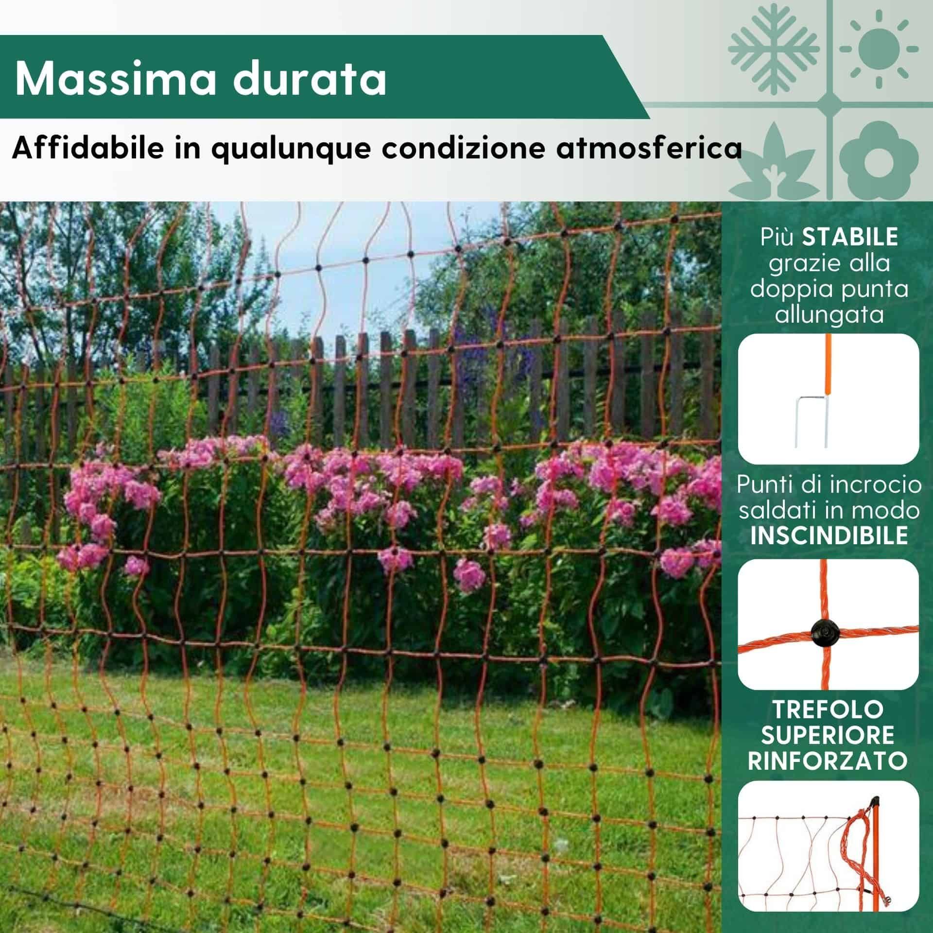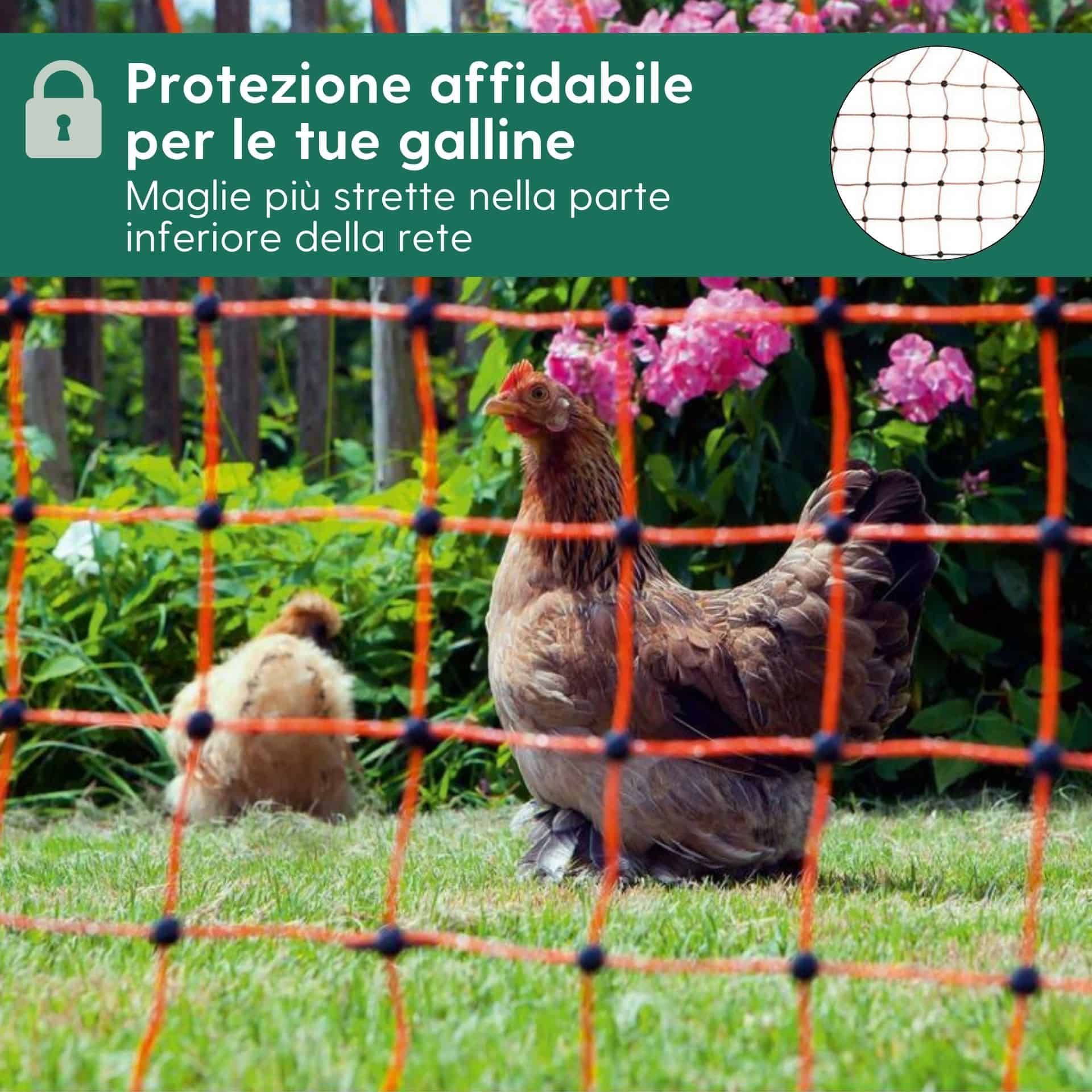 The chicken net has in the lower section narrow meshes which makes the net especially for herding poultry such as chickens, turkeys or ducks. But also other smaller animals can be herded with the mobile fence excellent, such as pigs, goats, dogs or as a sheep net. In addition to the narrower meshes, sagging of the net is prevented with the reinforced upper strand. Sturdy plastic stakes with double points ensure the fence stands well in earthy or sandy soils. The chicken fence is equipped with an orange strand, which makes it especially good for humans and animals visible. The color also provides a natural deterrent and effectively increases herding safety. The good herding properties are also ensured by a plastic seal at each mesh cross point, which is irremovably welded. For additional stability, we recommend placing a wooden post in each corner of the net.