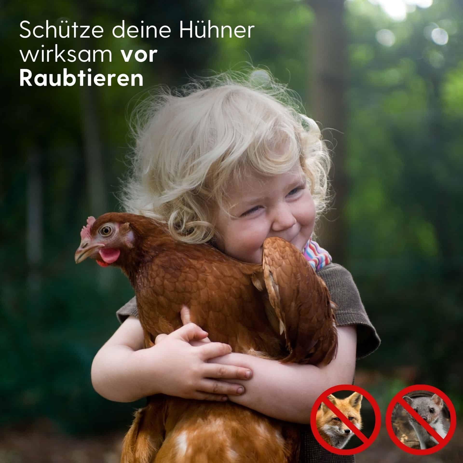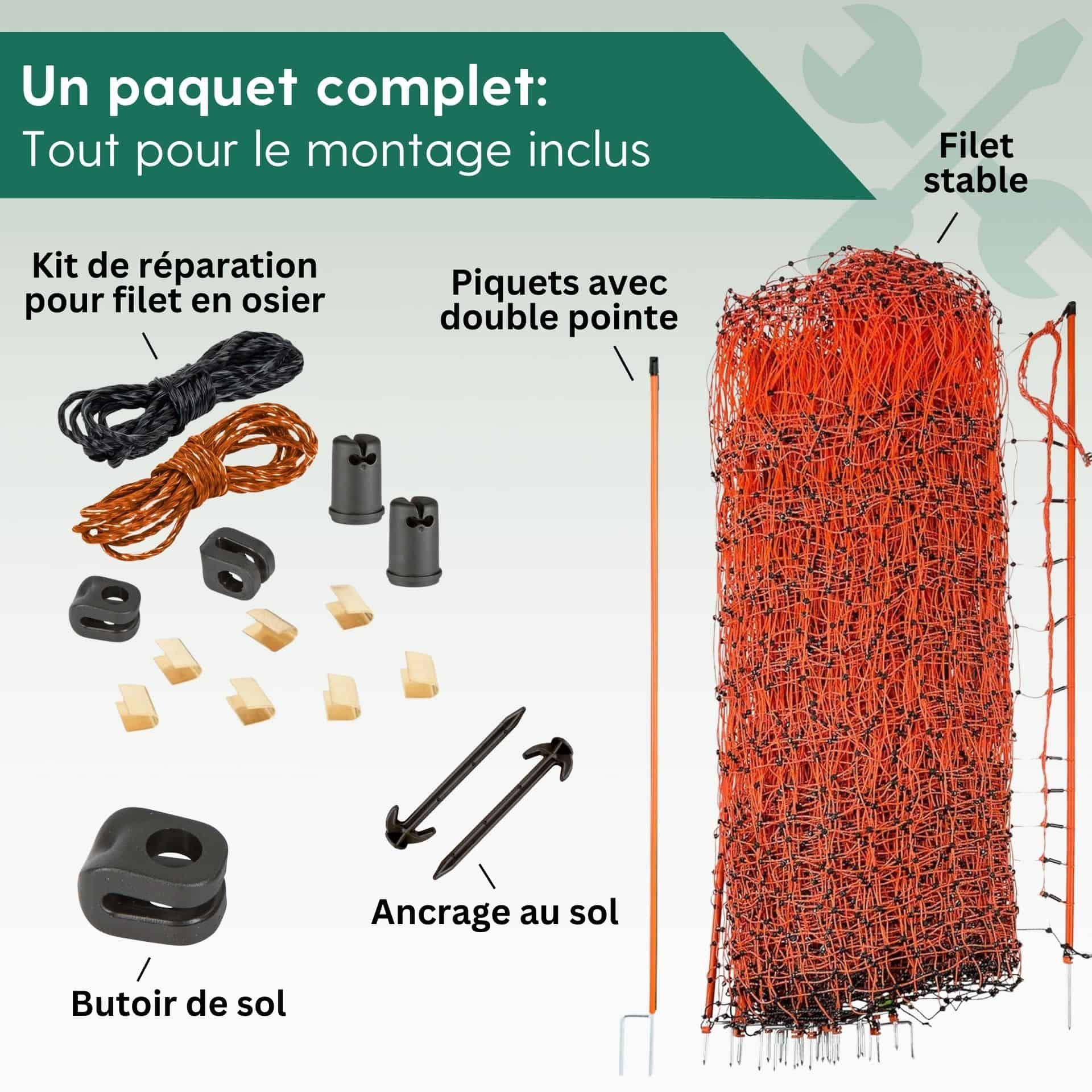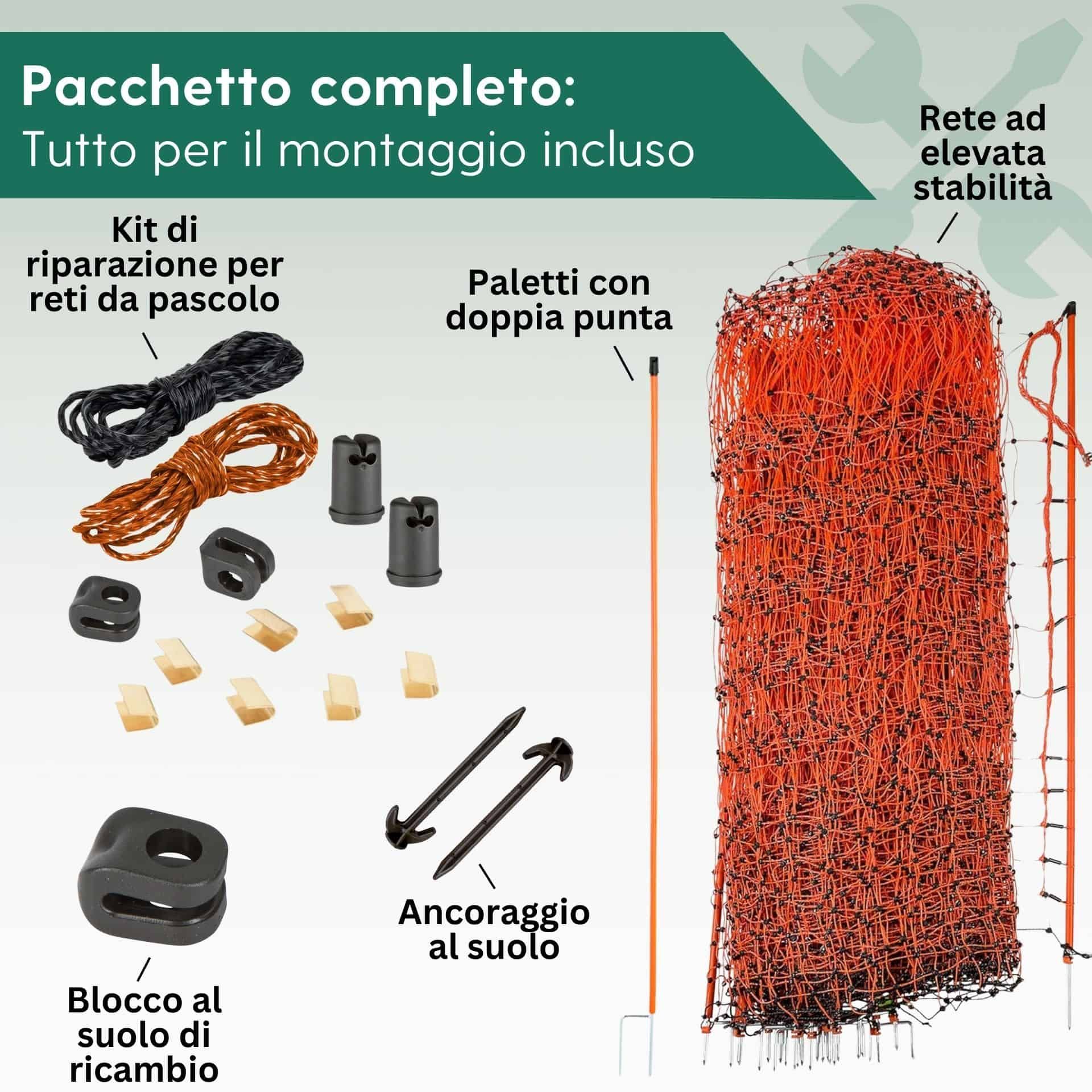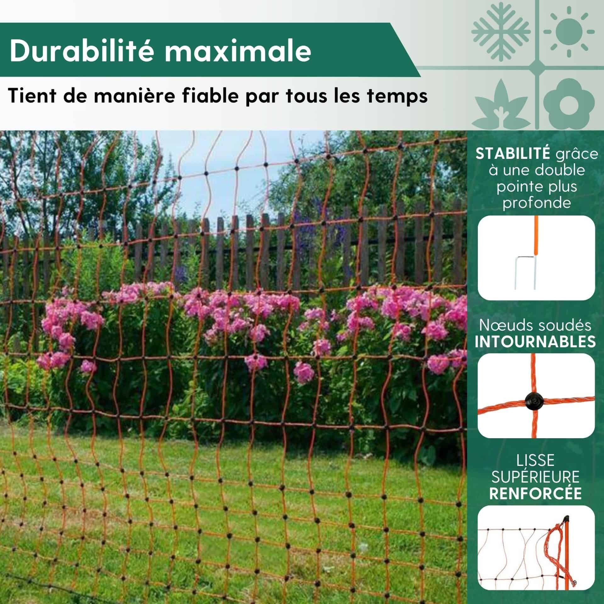 The chicken net has in the lower section narrow meshes which makes the net especially for herding poultry such as chickens, turkeys or ducks. But also other smaller animals can be herded with the mobile fence excellent, such as pigs, goats, dogs or as a sheep net. In addition to the narrower meshes, sagging of the net is prevented with the reinforced upper strand. Sturdy plastic stakes with double points ensure the fence stands well in earthy or sandy soils. The chicken fence is equipped with an orange strand, which makes it especially good for humans and animals visible. The color also provides a natural deterrent and effectively increases herding safety. The good herding properties are also ensured by a plastic seal at each mesh cross point, which is irremovably welded. For additional stability, we recommend placing a wooden post in each corner of the net.