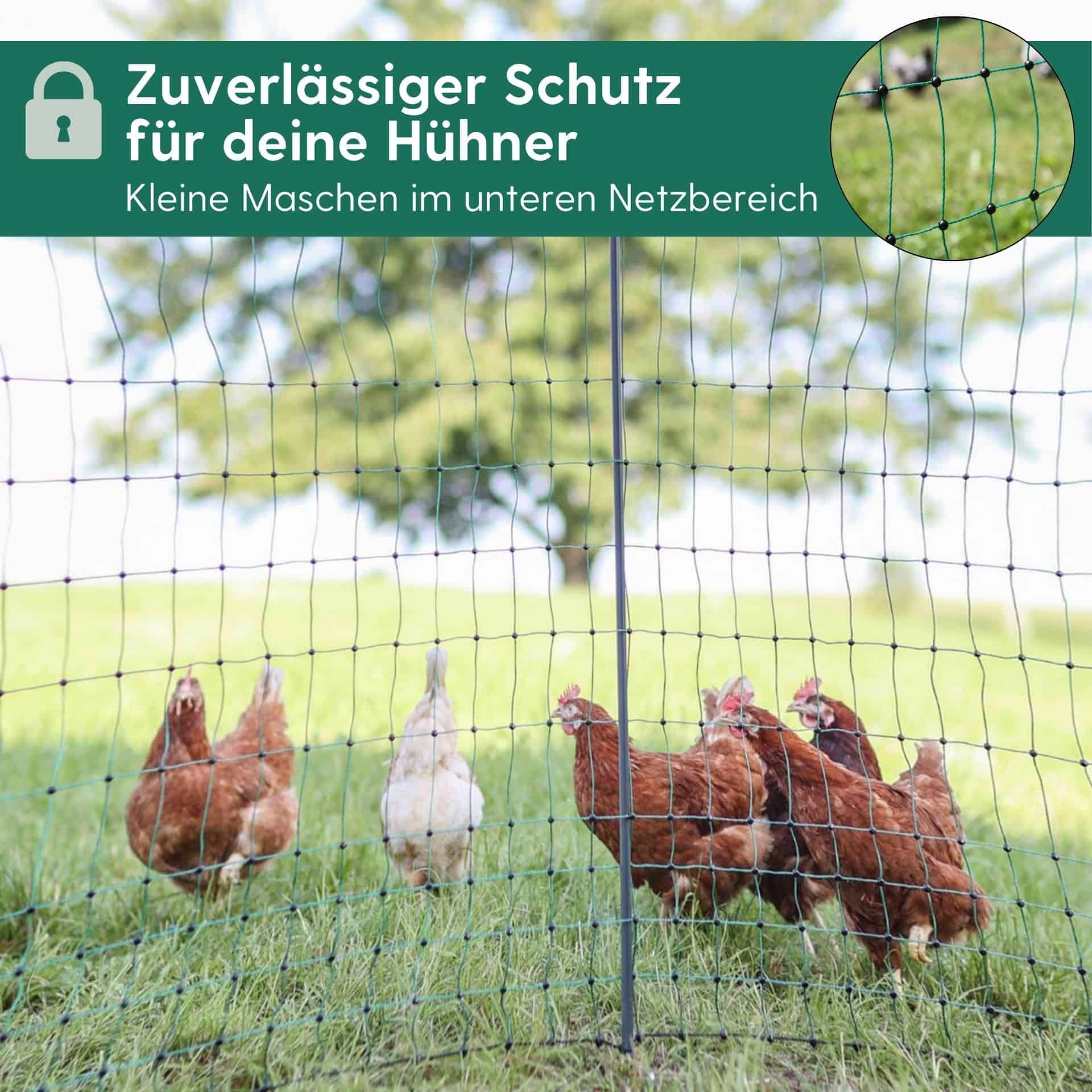 Order + set up + protect chickens: With our top pasture net for poultry farming you can fence your chickens safely. Optionally electrify with a pasture fence device.