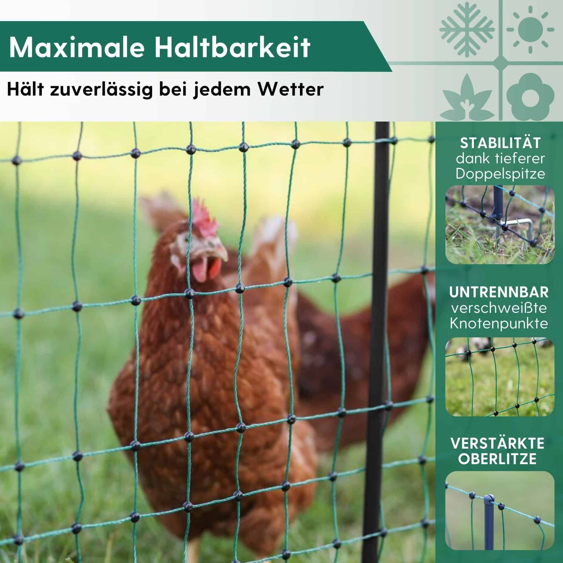 The sturdy plastic stakes with double tips ensure that the pasture fence stands well in earthy or sandy soils. The good herding properties are additionally ensured by a plastic seal at each mesh cross point, which is irremovably welded. The chicken fence is equipped with a green strand, which makes it particularly harmonious with the surroundings. For additional stability, we recommend placing a wooden post in each corner of the mesh.