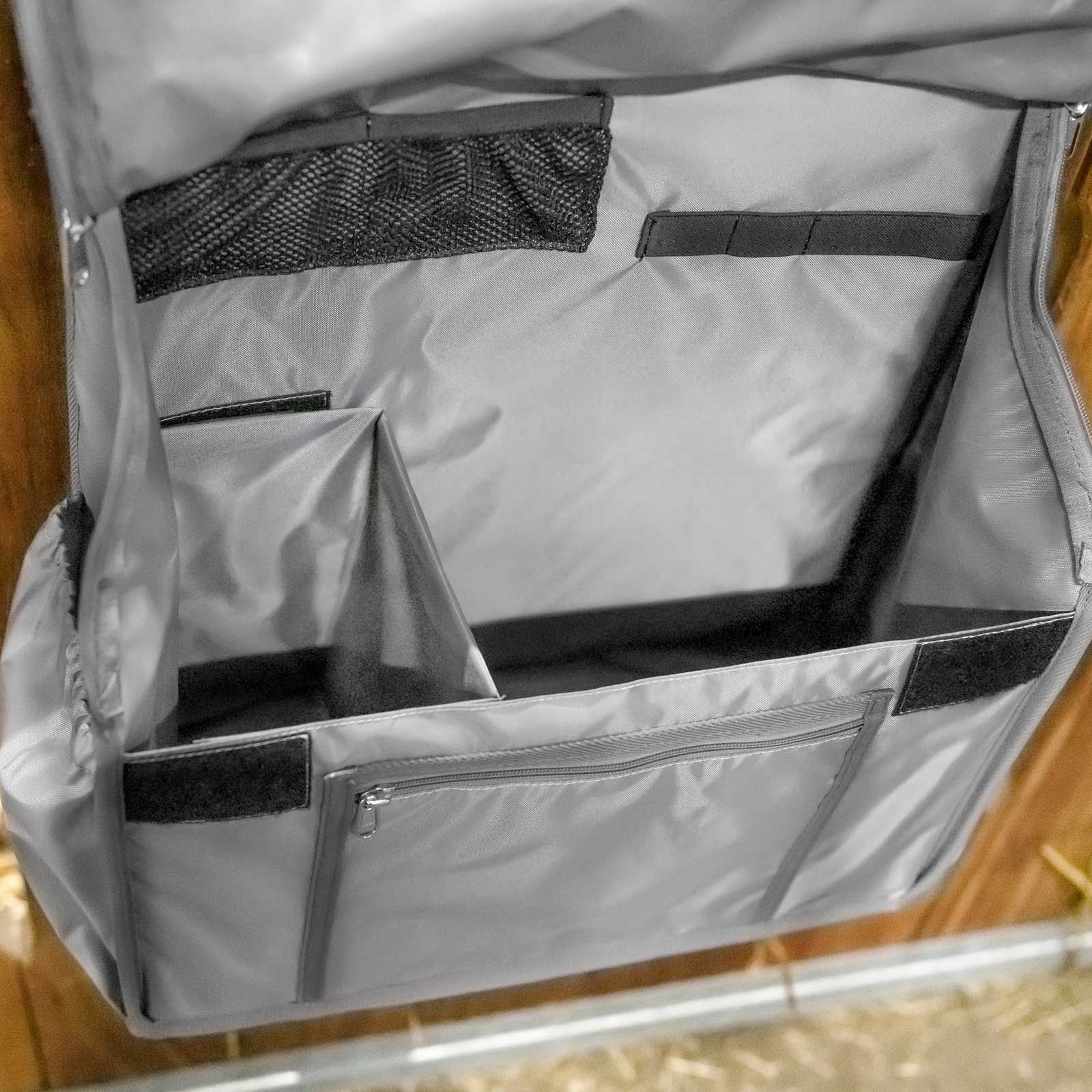 - Stable hanging bag for neat storage of e.g. bells, grooming kit, mane spray, creams etc. directly by the horse.