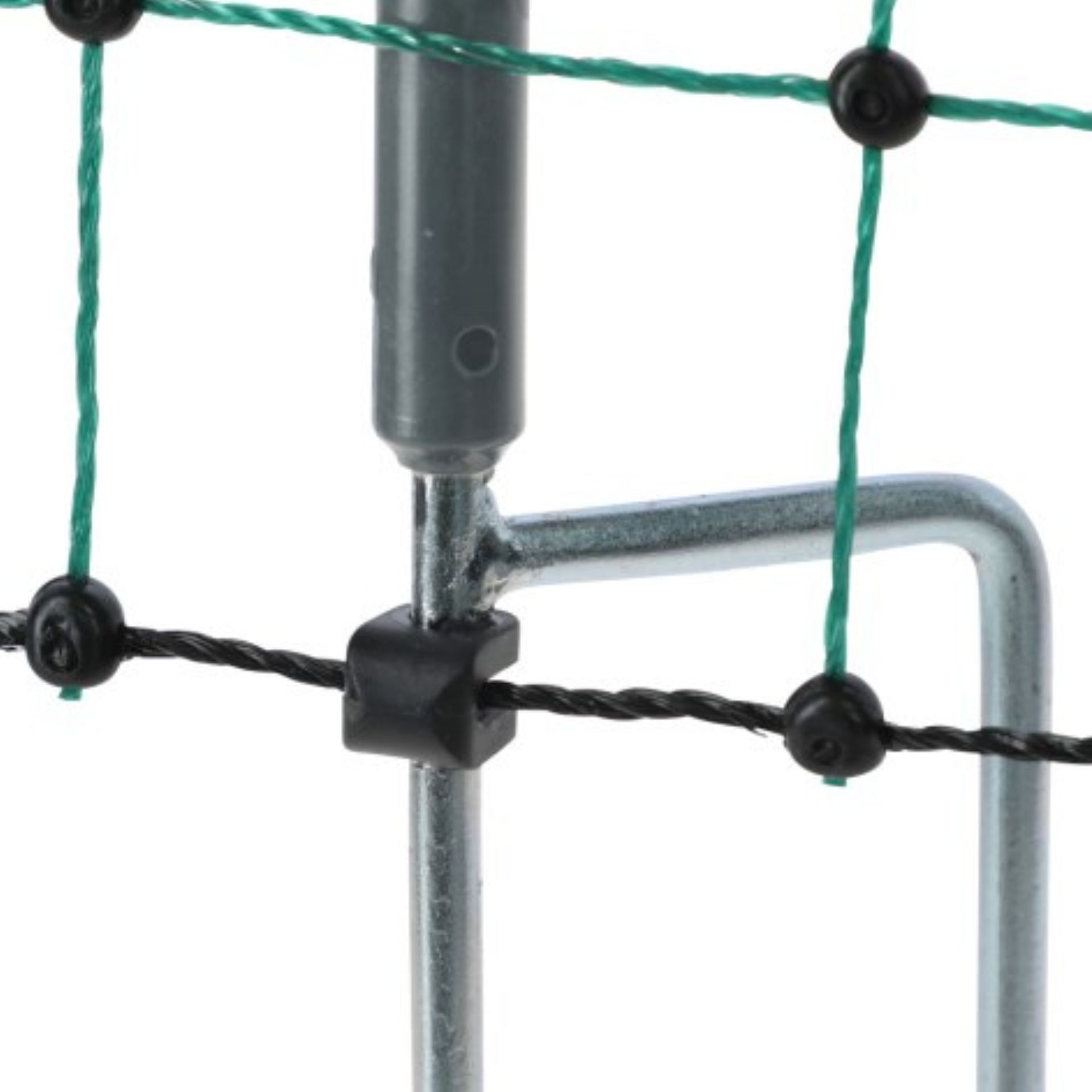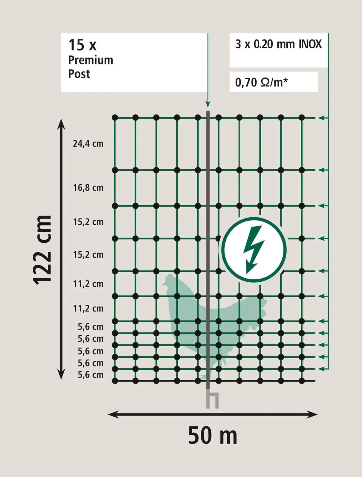 The extremely robust and stable premium poles offer absolute safety, preventing the risk of falling nets. Thanks to the tight knitted net in the lower part, the net is particularly suitable not only for chickens, geese and turkeys, but also for lambs. The ends of the nodes are welded in an extremely robust way, guaranteeing a long durability, also under the effect of UV rays.