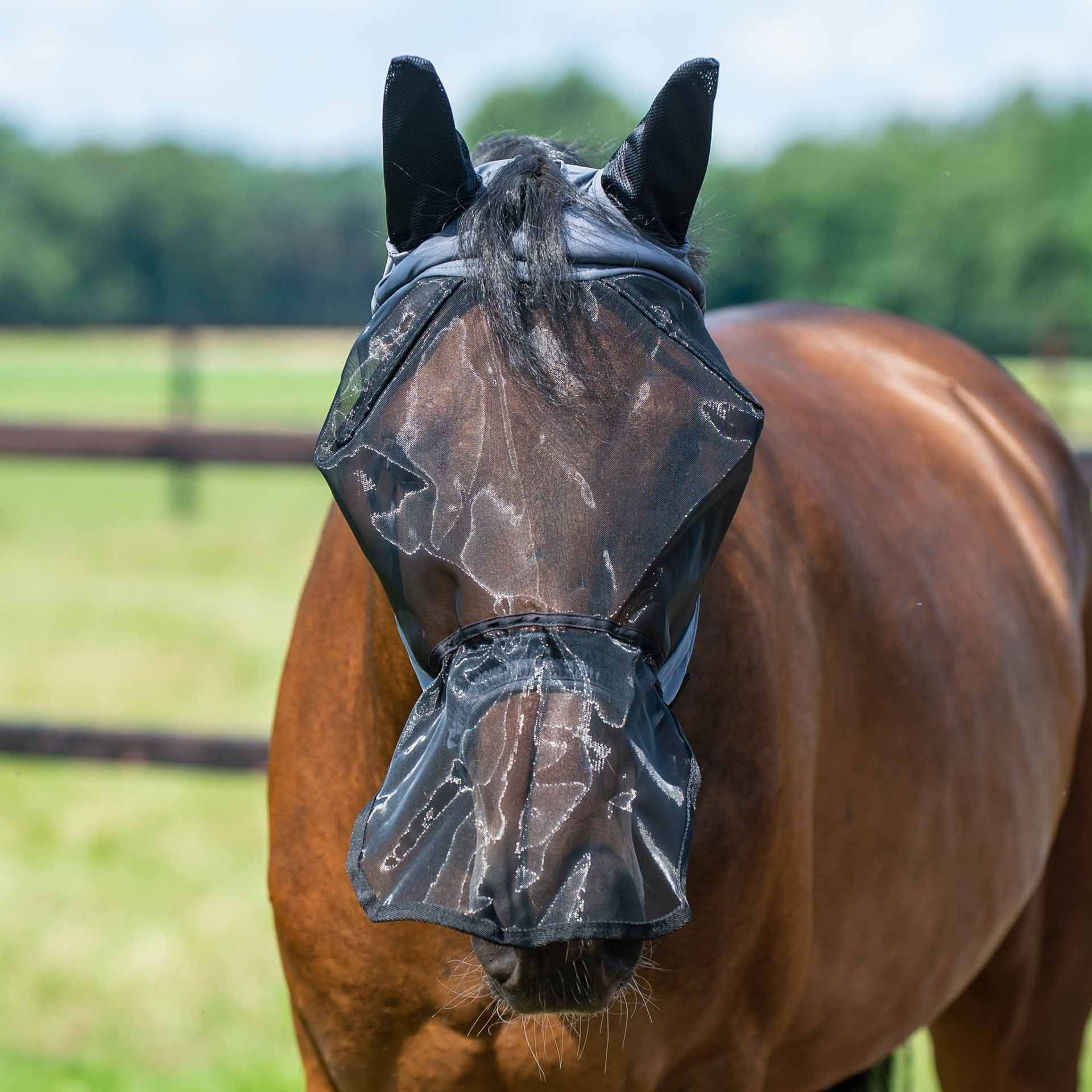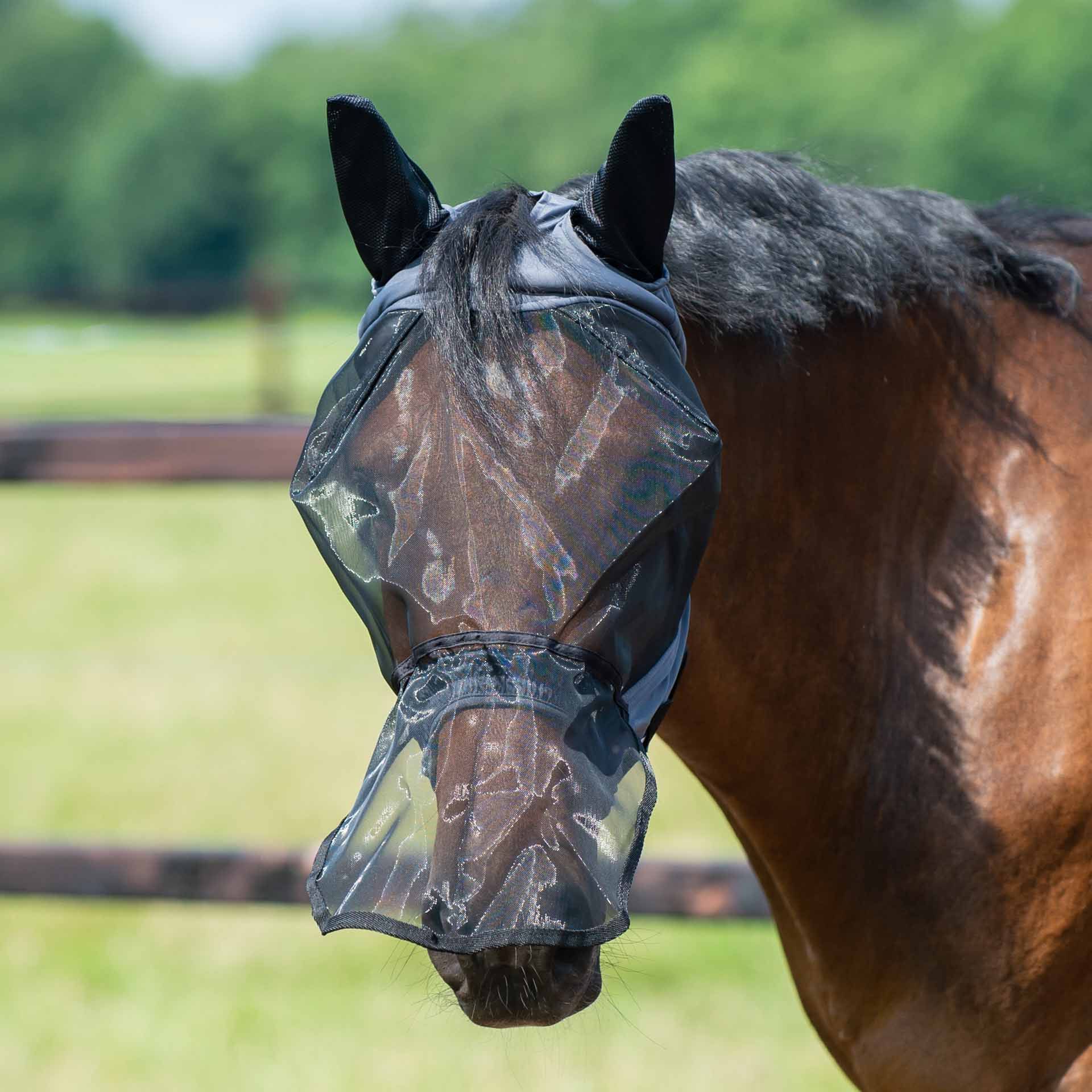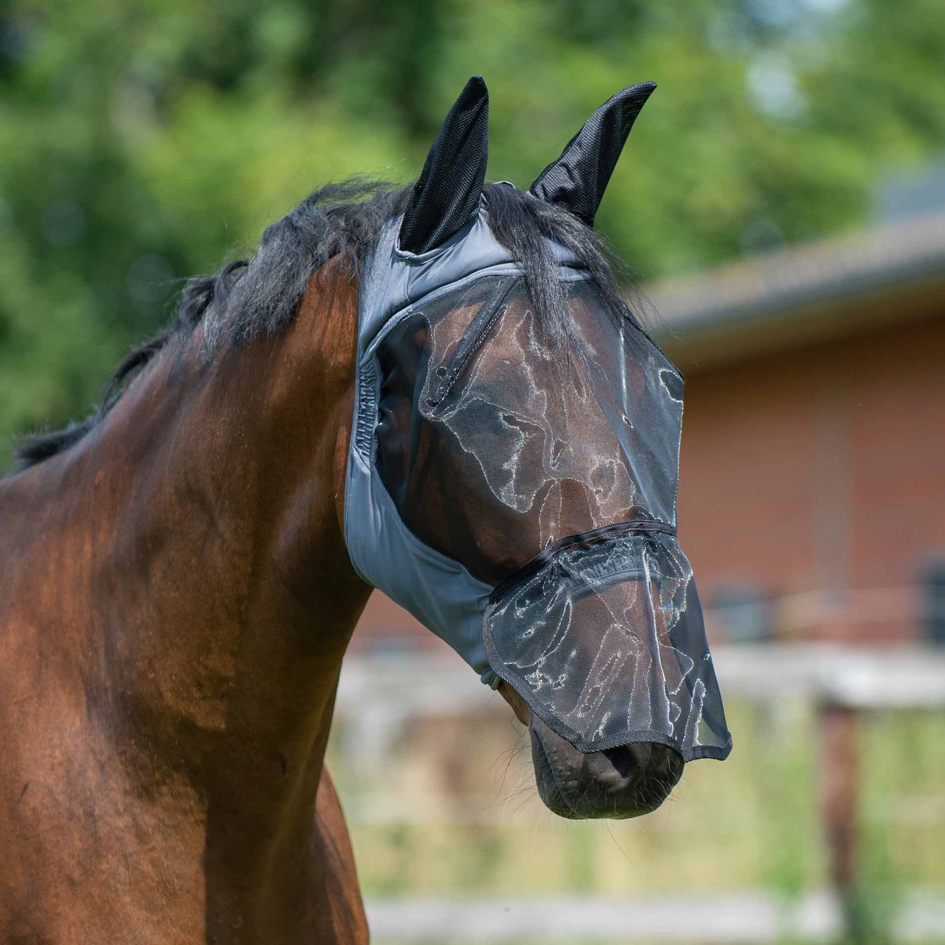 The headboard consists of soft, elastic Lycra® nylon material, which guarantees safe fit and comfort. The ears are made of a well -ventilated network material that ensures additional protection and convenience. In the neck area, the fly mask is generously cut to ensure a secure hold without restrictions.