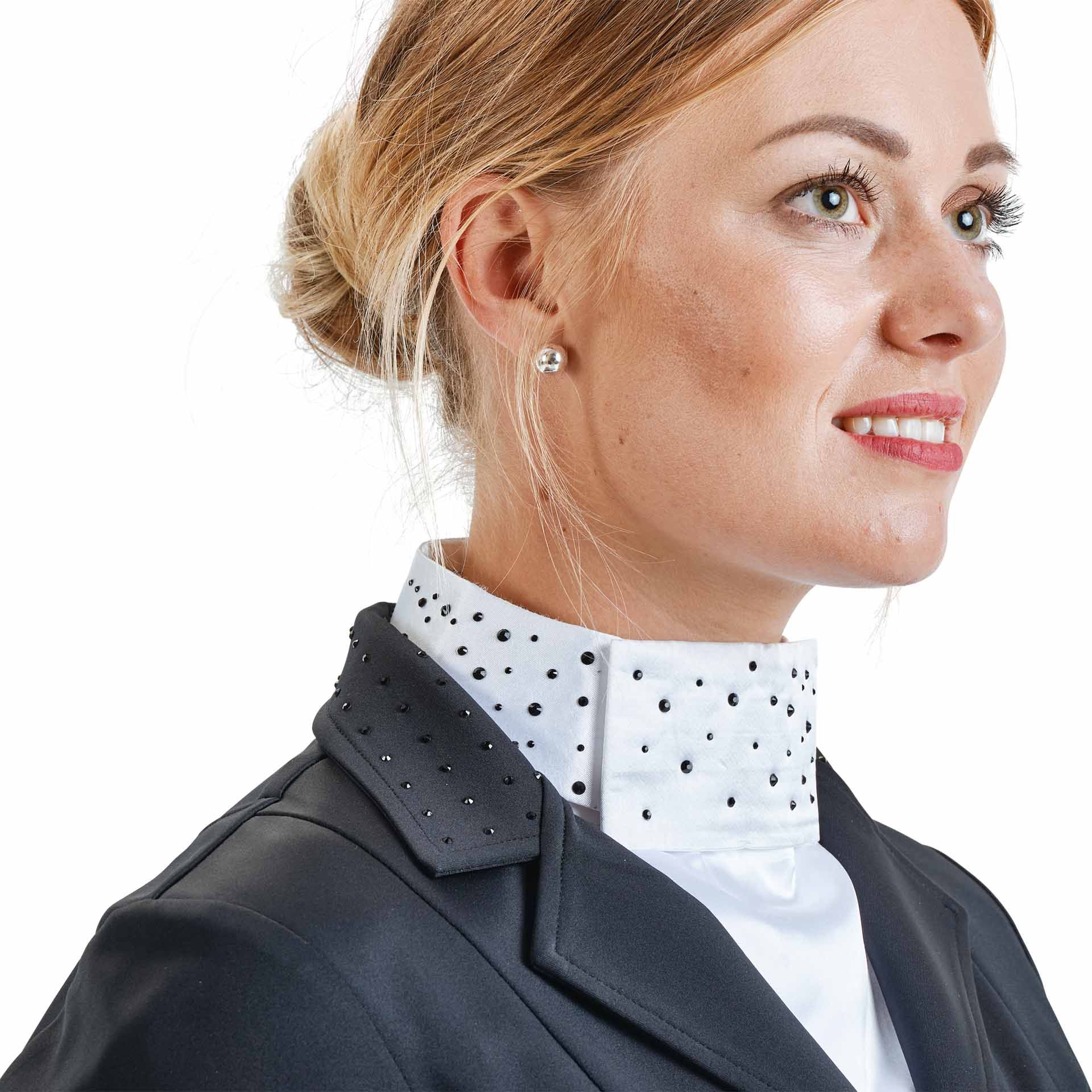 The Busse plastron Emilia is an exclusive plastic made of noble glossy satin. His stand -up collar is refined with rhinestones at the front, so that he gives every riding outfit a touch of elegance and shine.