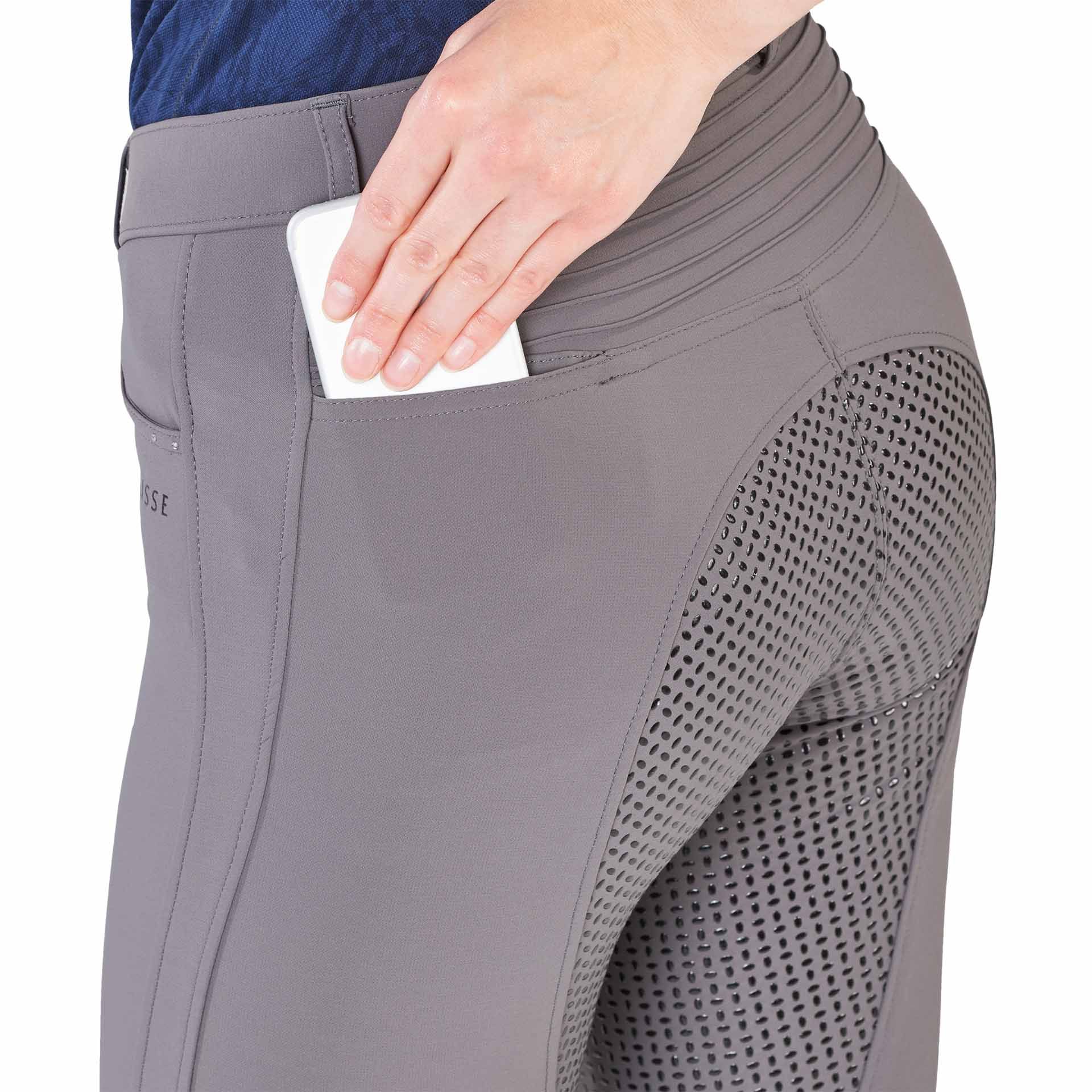 The breeches convinces with their elegant and sporty design, which has figure -shaping details. It has draped folds below the federal government for a well-shaped buttocks, shaping strips curved to the side along the thighs and a cleverly hidden and perfectly positioned smartphone bag in the buttocks area. Two classic insertion bags at the front are tone-in-tone with two small rhinestones and a silicone print logo.