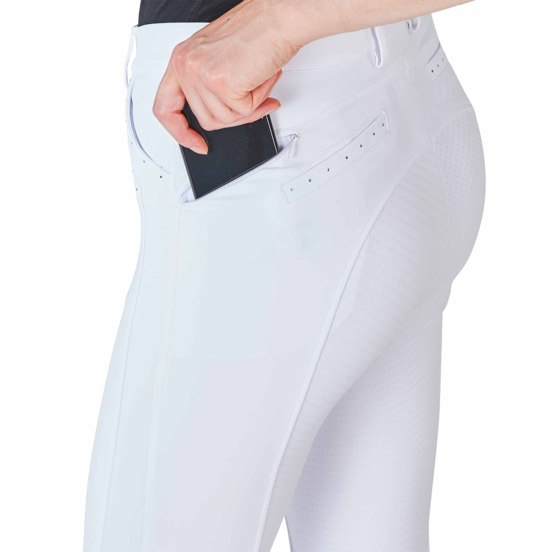 The buses riding pants zaya is a functional breeches that offers all year round. It has an elegant design with rhinestones, a smartphone bag, two insert pockets and a classic cut with medium waist height. It consists of a highly elastic, two -layer functional material and is machine washable at 30 ° C.