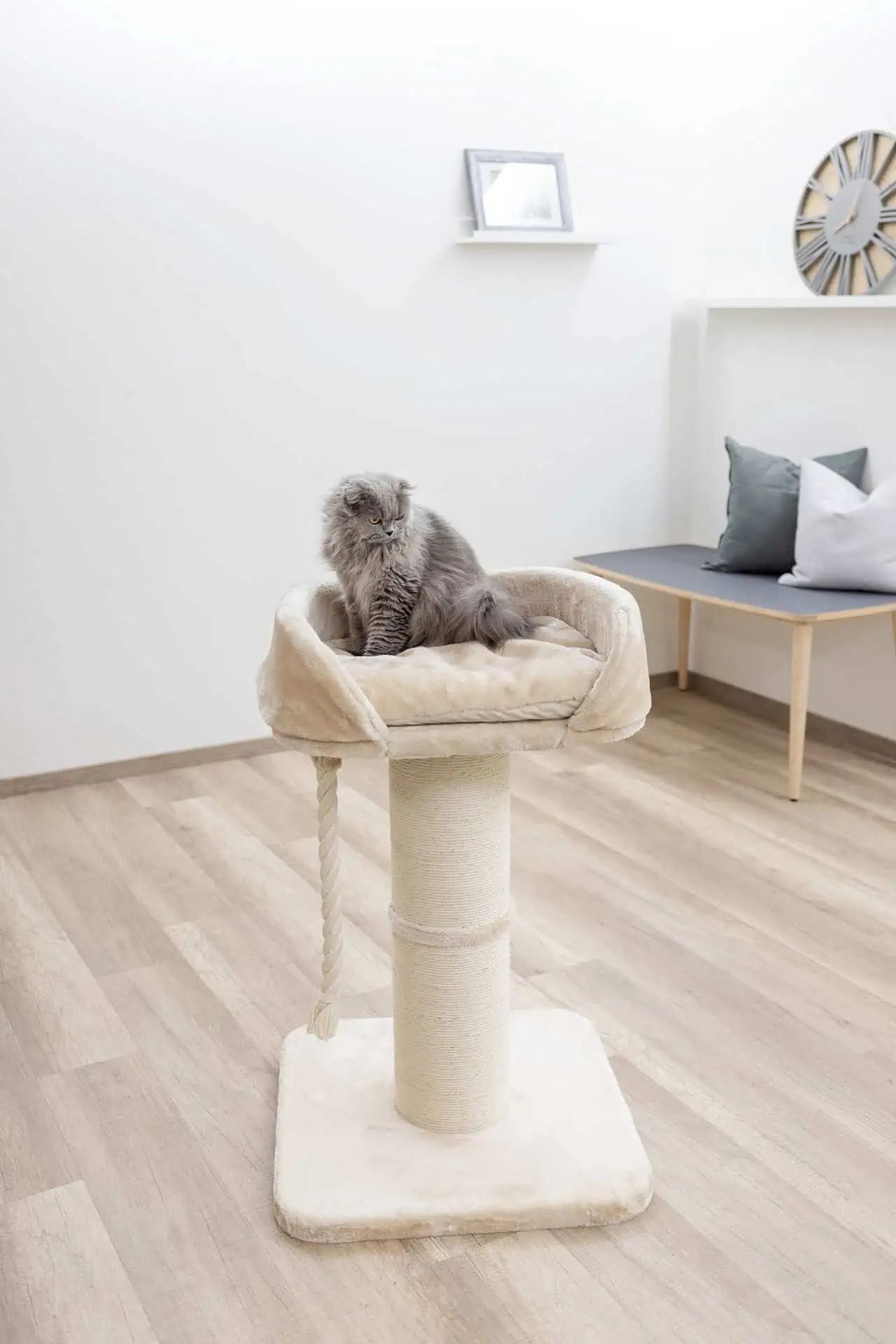 The scratching tree Toni XL has an extra strong base plate and a thick scratch pillar, which is wrapped with a high -quality, 5 mm thick natural rope. In addition, it offers a large, comfortably padded lying area and a robust Sisal game rope for additional fun. The pillow is washable at 30 ° C and the lying bed is hand washable, which makes cleaning a child's play.