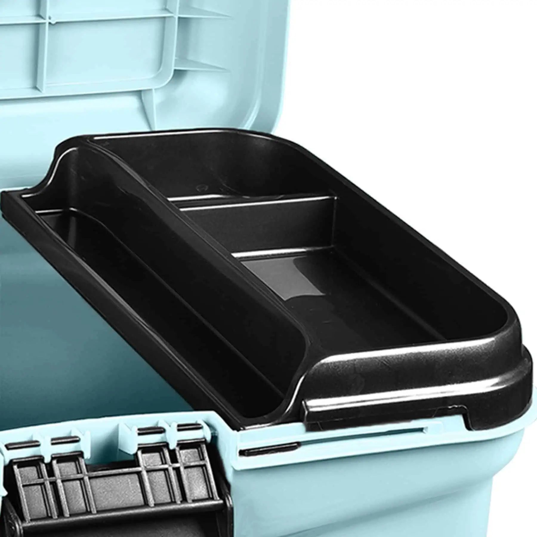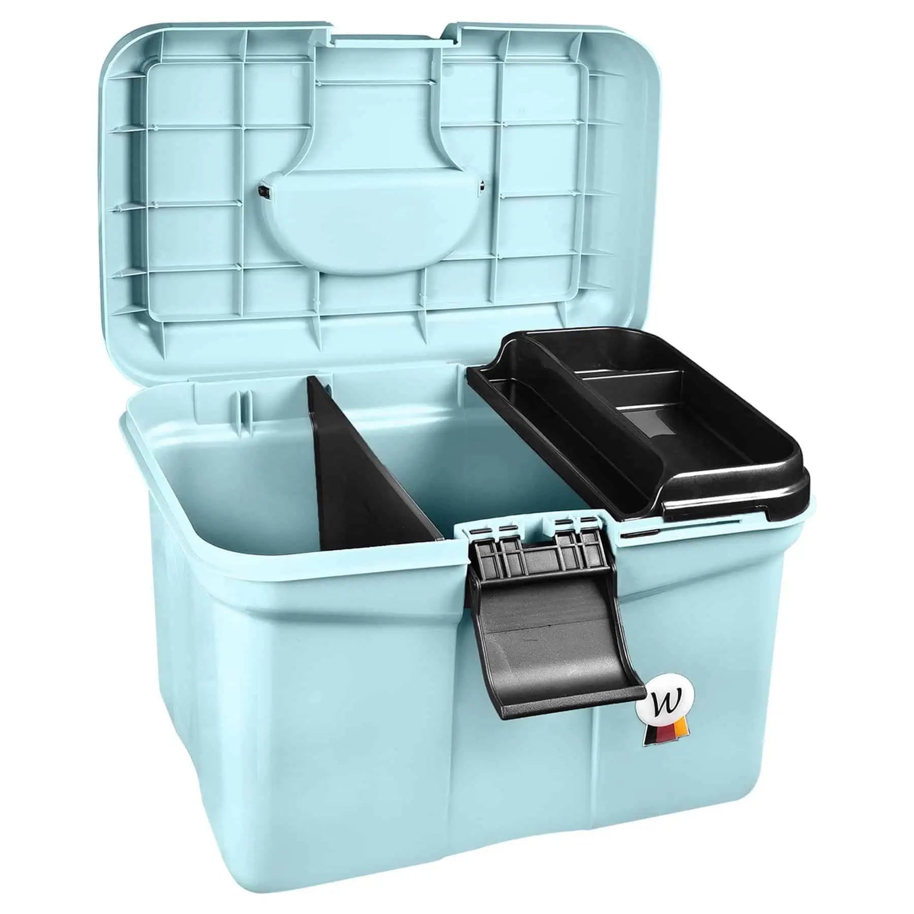 High quality grooming box in recycled plastic. The perfect companion in the stable and at competitions. Retractable handle, closable snap fastening, doubly adjustable partition, removable small parts compartment and its light weight make it stand out!