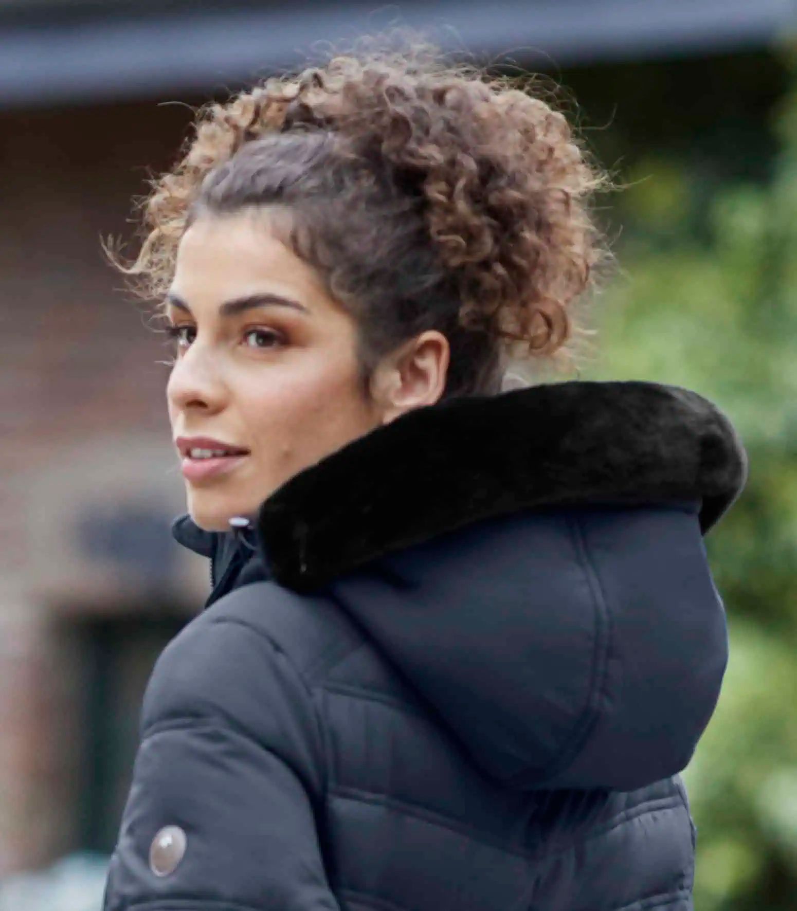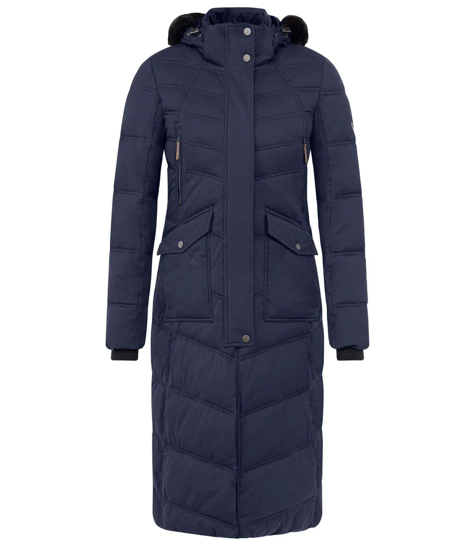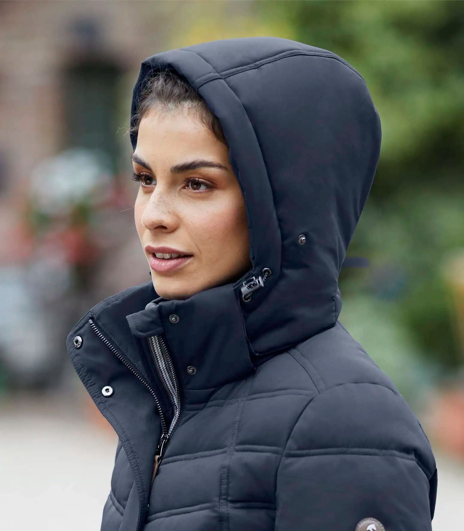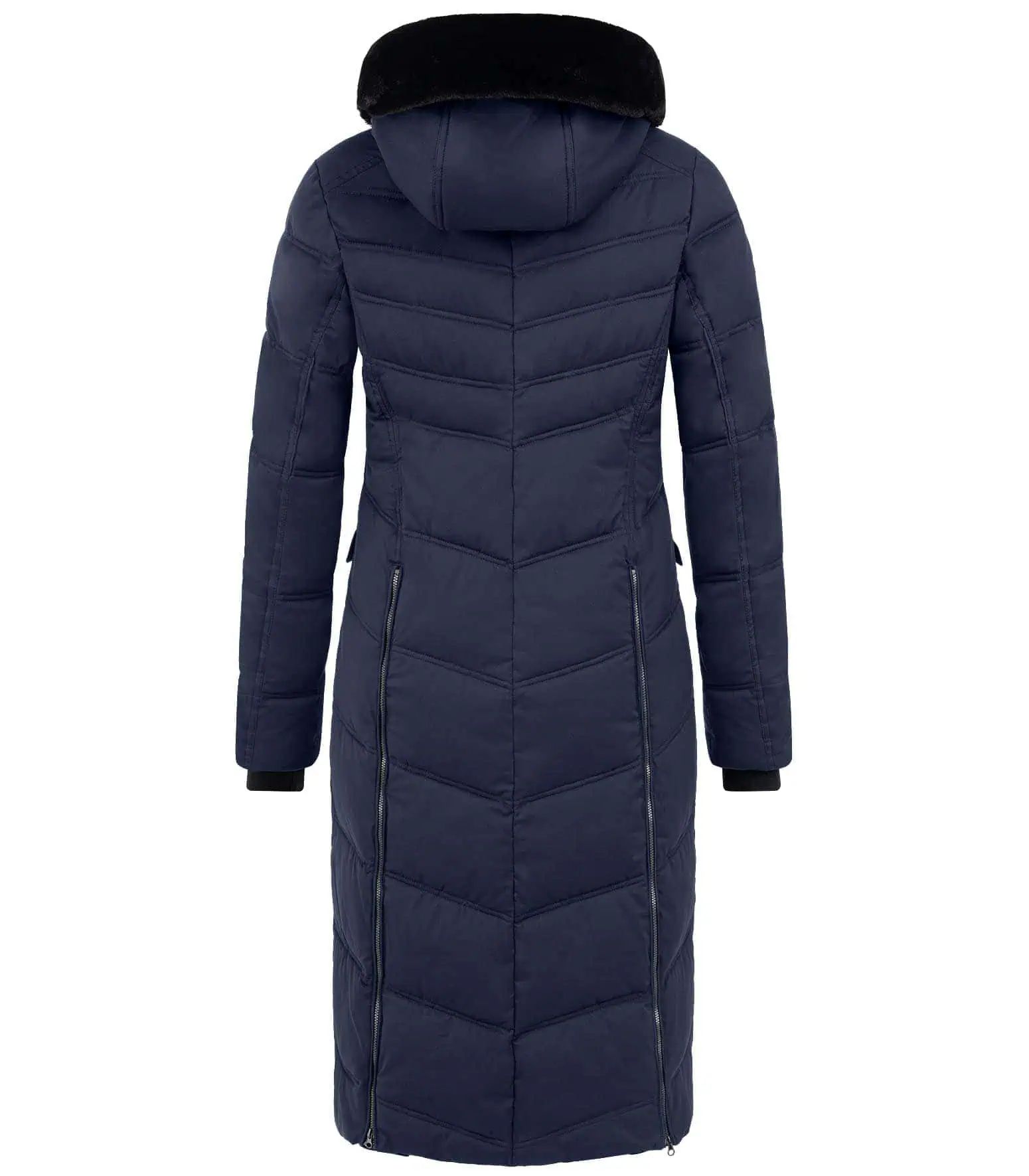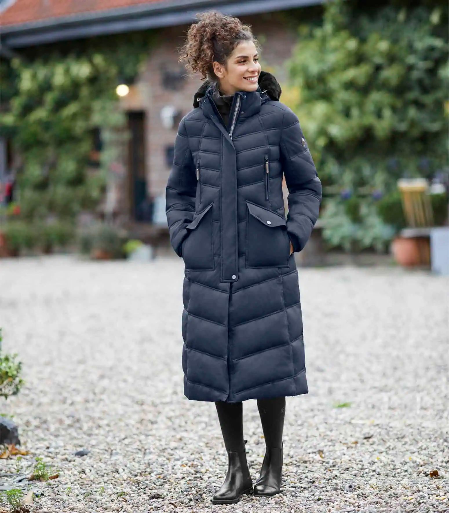 Long, quilted coat with downtype filling, ideal for cold winter days