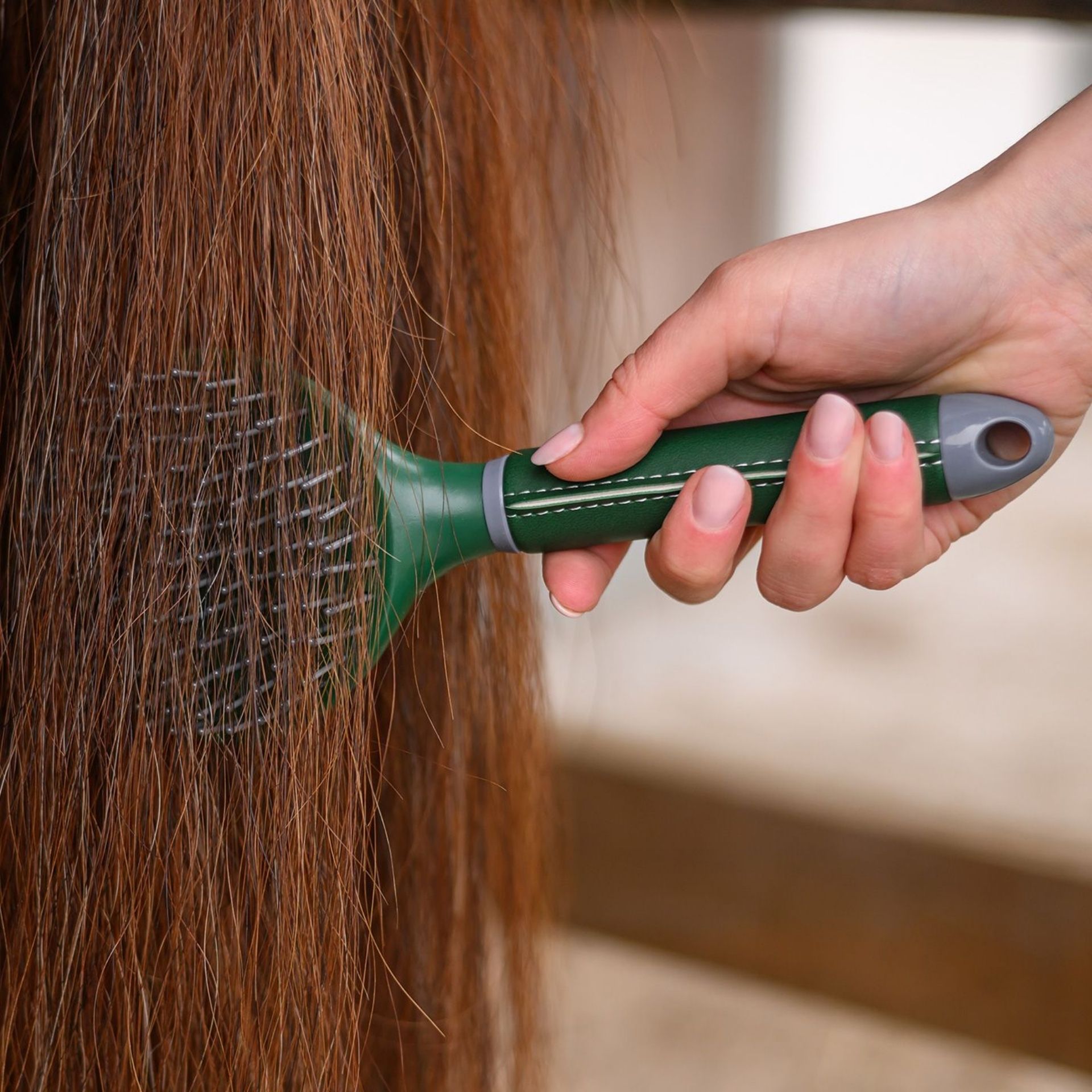 Mane and tail brush with high-quality synthetic leather brush handle.