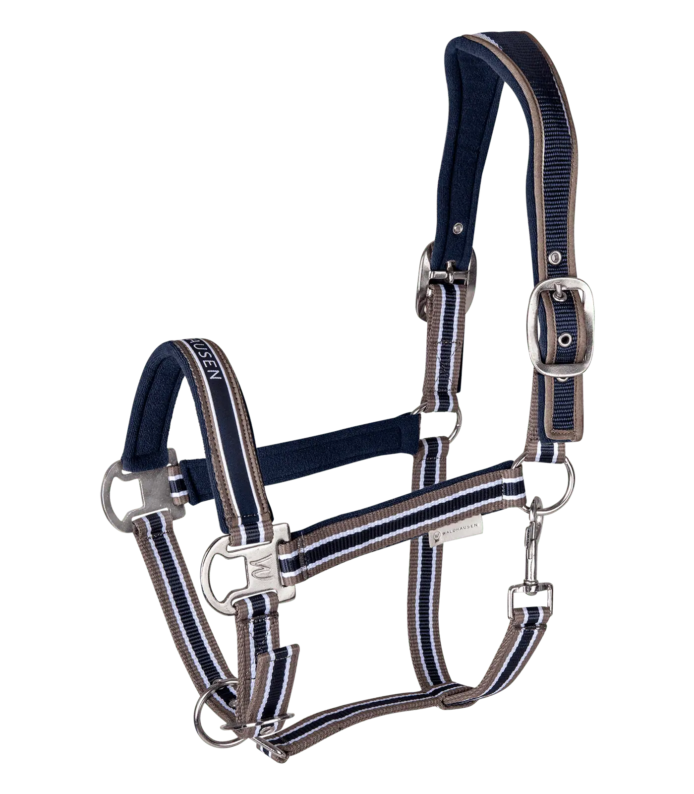 Quality halter with soft padding on neck and nose area as well as on the cheekpieces. Anatomical headpiece for pleasant wearer comfort. Multiple adjustments possible on chin strap and headpiece. With silver-coloured metal fittings.