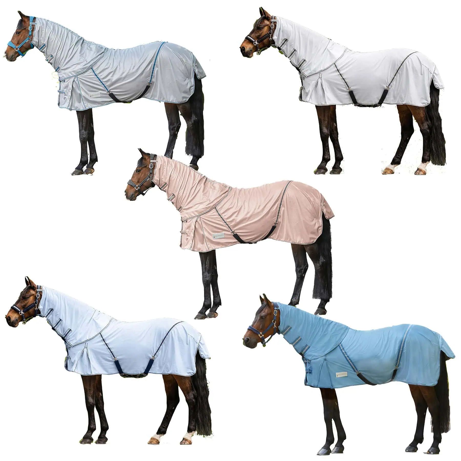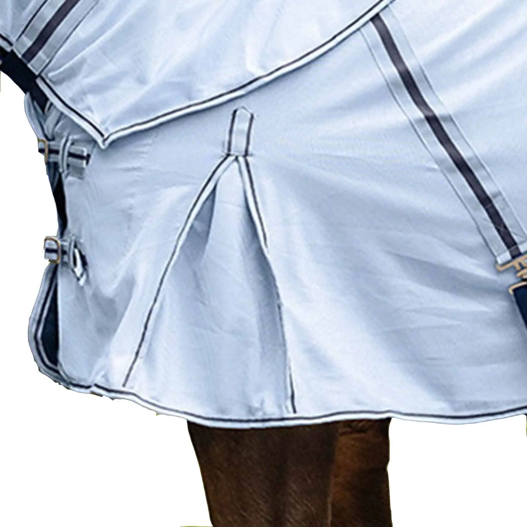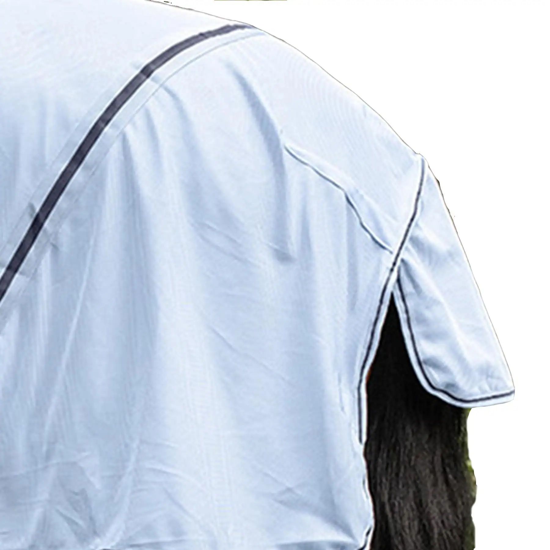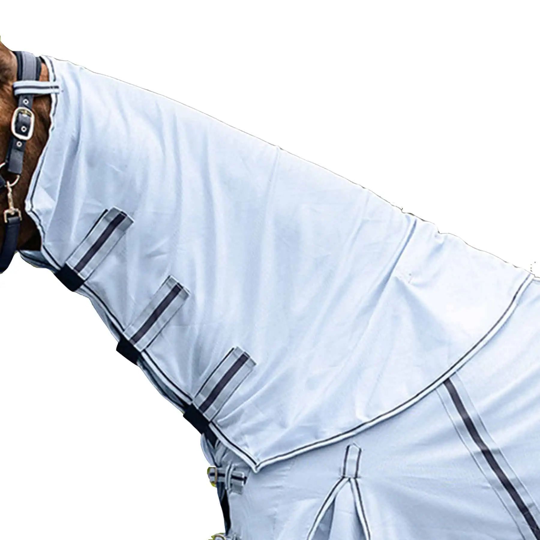 High quality fly rug made of finely woven fabric, featuring cross straps and a tail flap to protect against annoying insects. Double front fasteners, kick pleat, fillet string and leg straps ensure a good fit. Supplied with detachable neck part to protect neck and mane.