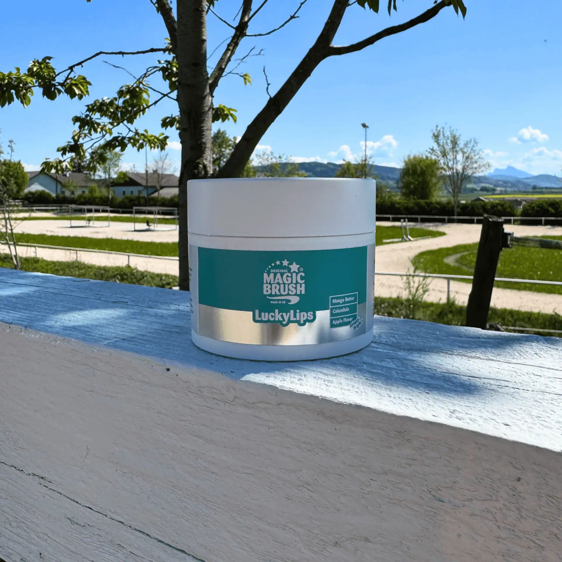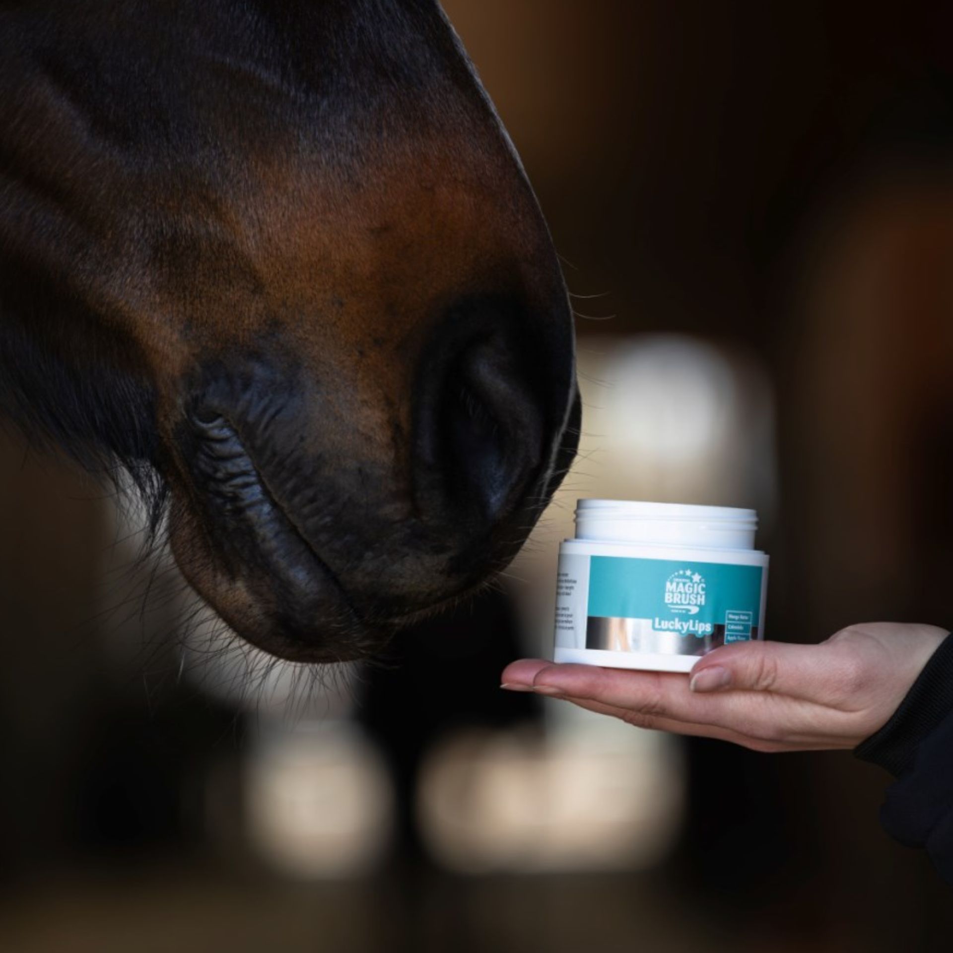 Lucky Lips lip balm is a special care product used to care for the delicate skin around horses' mouths. It is designed to prevent dryness and cracking caused by bit friction.