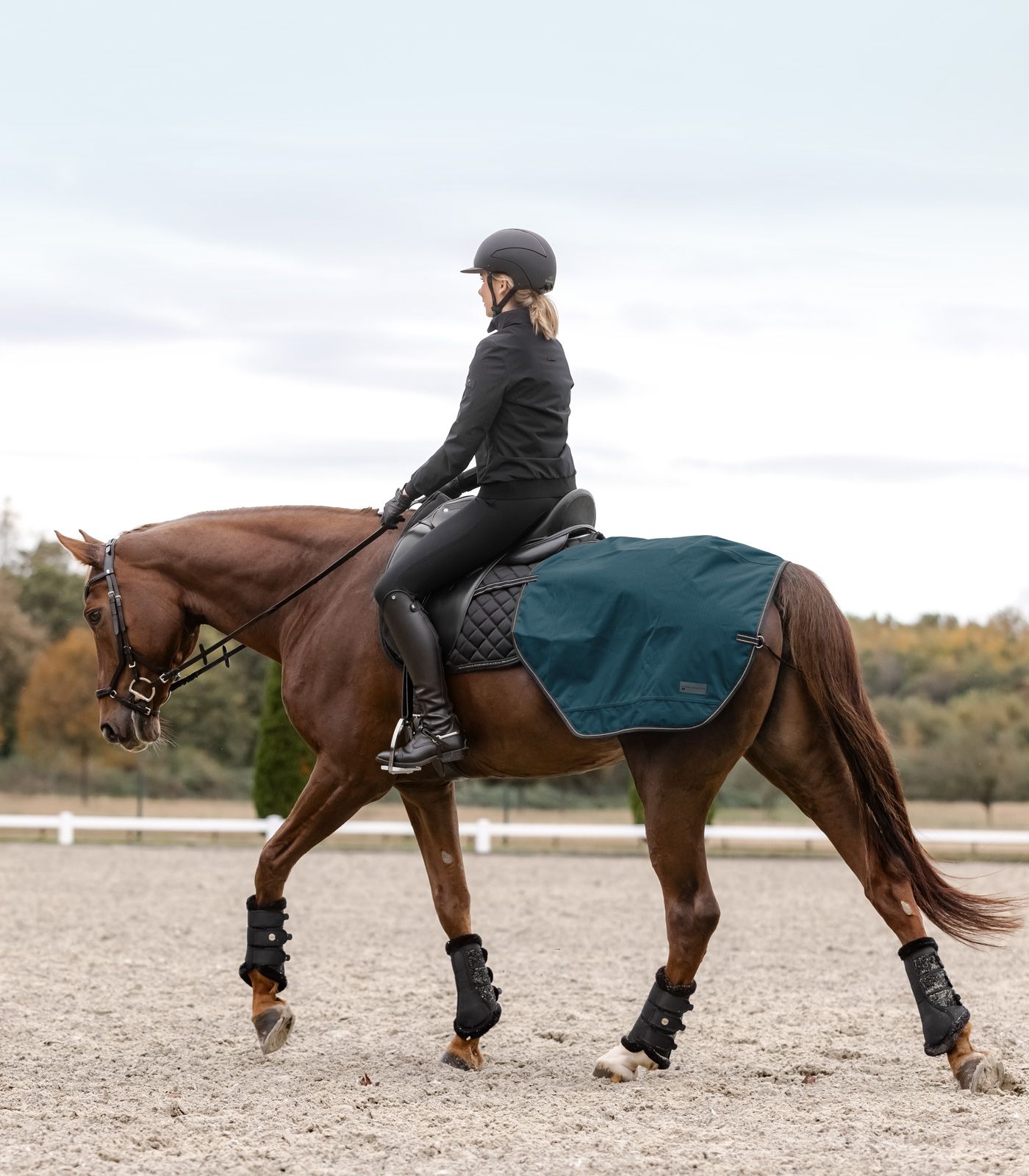 The kidney blanket is easily and securely attached to the saddle with long Velcro fasteners.