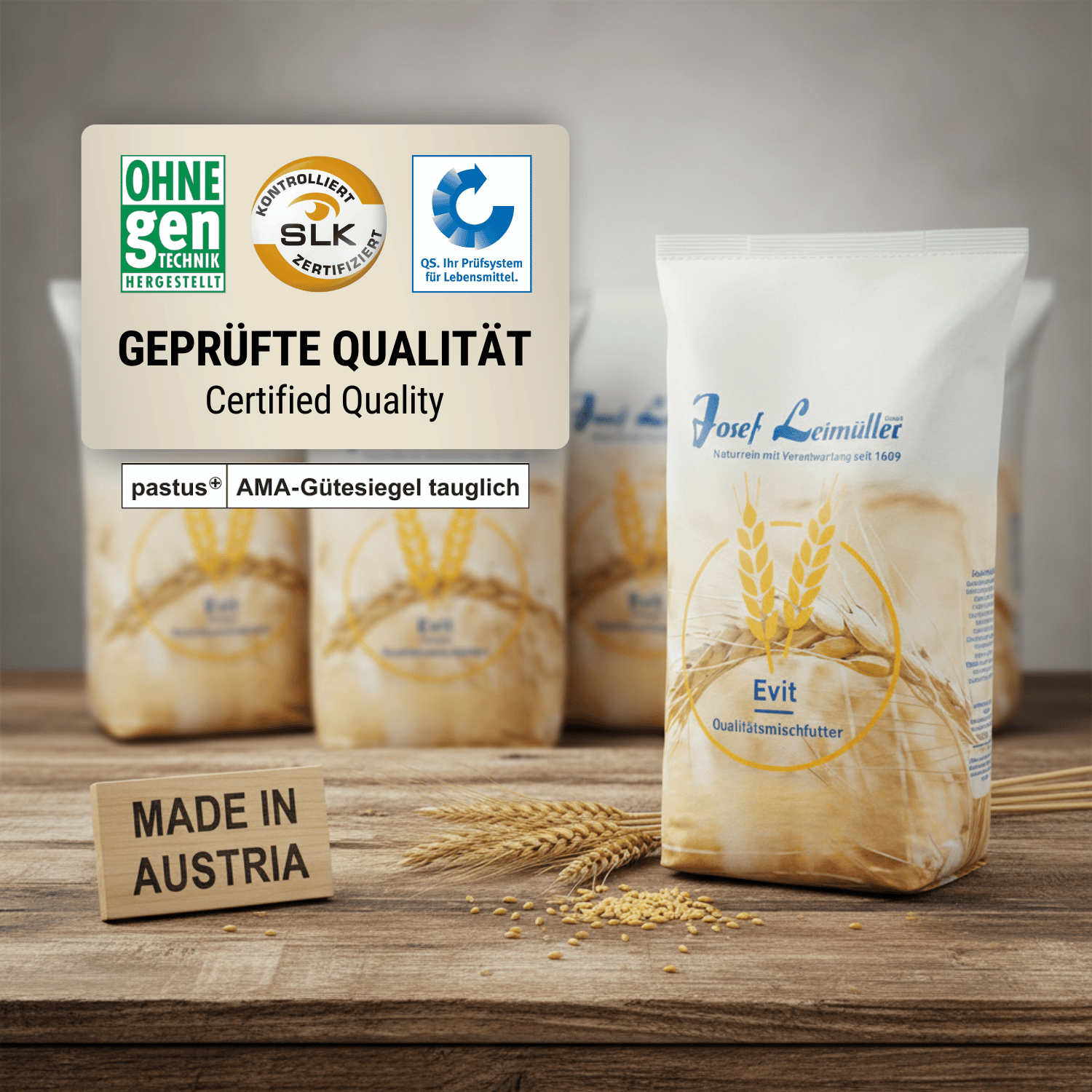 It is 100% Austrian, GMO-free and free of artificial additives, a pure natural product for the healthy nutrition of your poultry. The pastus+ - AMA quality seal guarantees the highest quality.