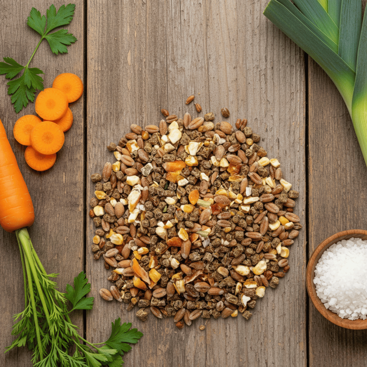 Parsley, leeks, beetroot, and carrots not only make our feed irresistibly tasty but also supply important vitamins and minerals. This varied mixture imitates the natural diet and stimulates the hens' pecking instinct.