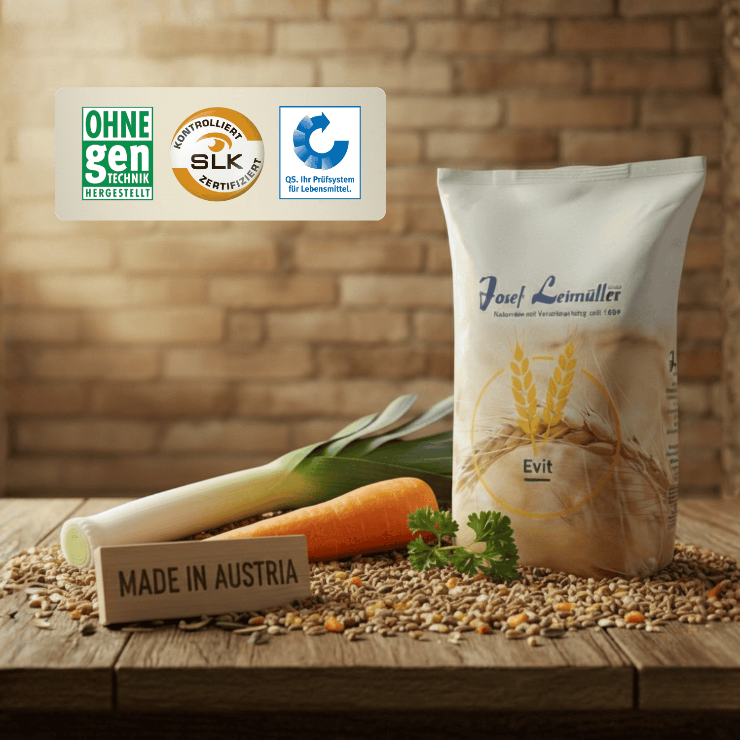 As a family business, Leimüller has been producing fresh and natural animal feed in Neumarkt am Wallersee for over 400 years. We stand for absolute transparency and only use high-quality, regional raw materials that pass our strict quality control. Our promise: The feed is guaranteed dust-free and GMO-free, which is monitored and certified by SLK GmbH. Many products are eligible for the AMA quality seal and our QS certification guarantees you adherence to the strictest quality standards.