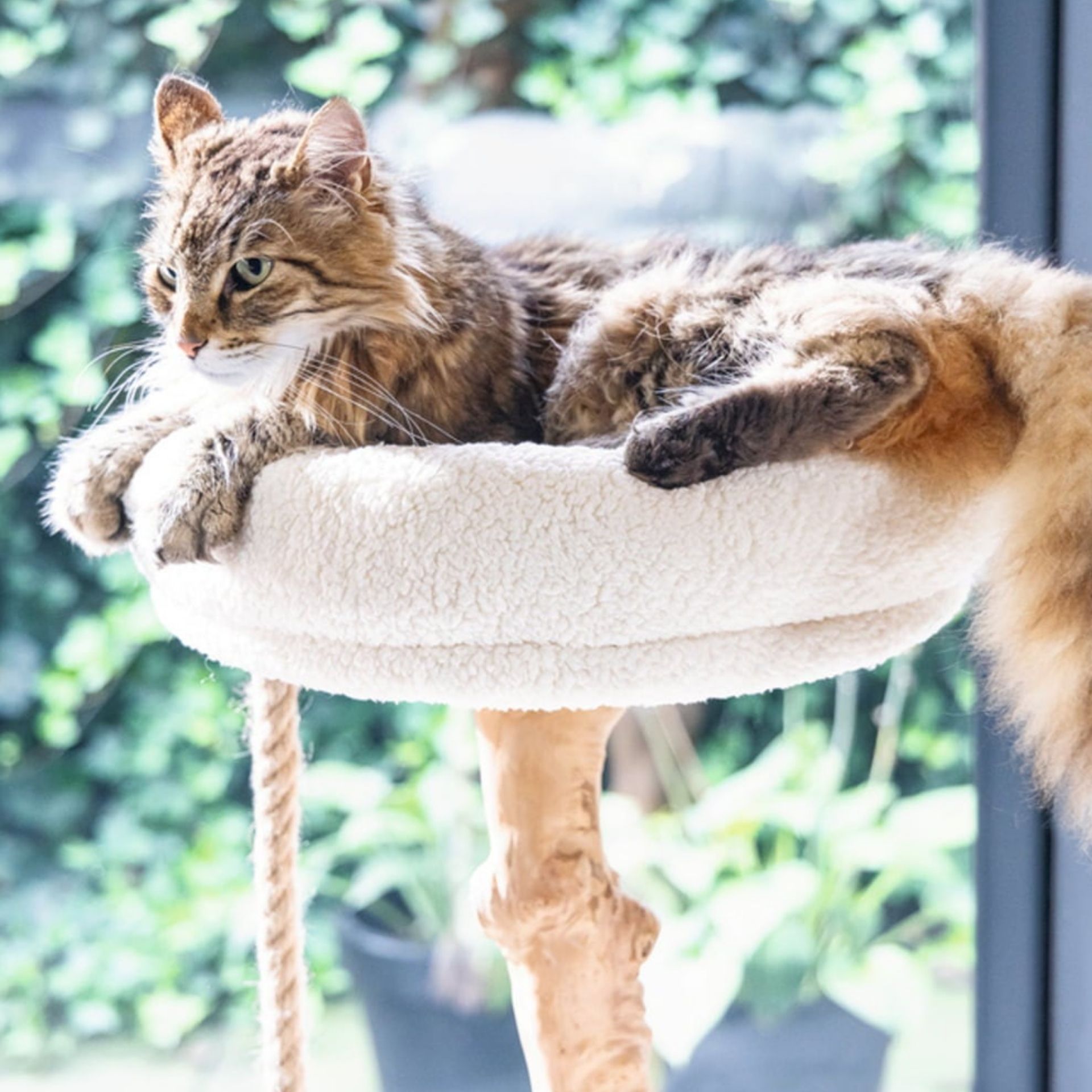 The Designed by Lotte Wooden Cat Tree Vilja combines natural pear and date wood with soft, white plush, creating an elegant resting and playing area for your cat. With a plush platform, a basket, a scratching post with jute rope, and an integrated play rope, it offers everything a cat could desire.