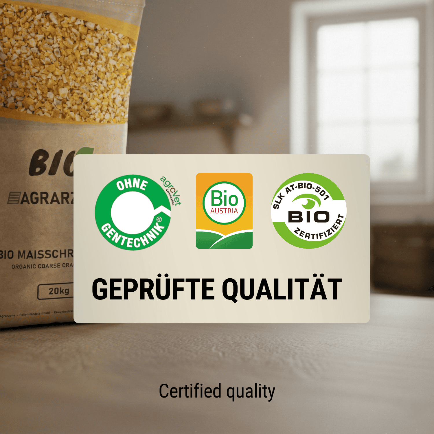 You’ll benefit from full transparency, as the corn comes 100% from regional organic farmers in Austria and meets the strict guidelines of Bio Austria. Because the feed is guaranteed non-GMO and grown without chemical pesticides, you’re making a valuable contribution to organic farming and can feed your animals with a clear conscience.